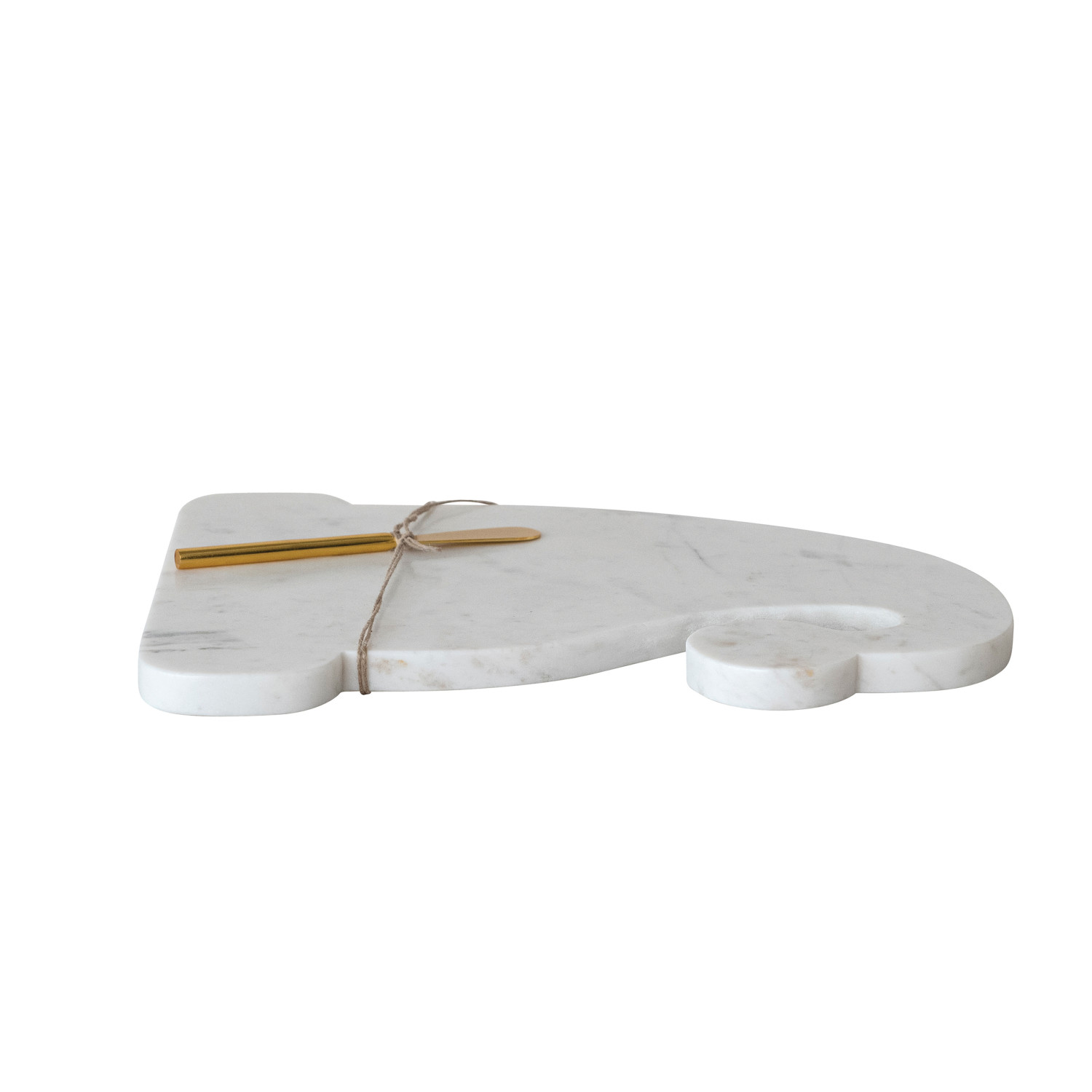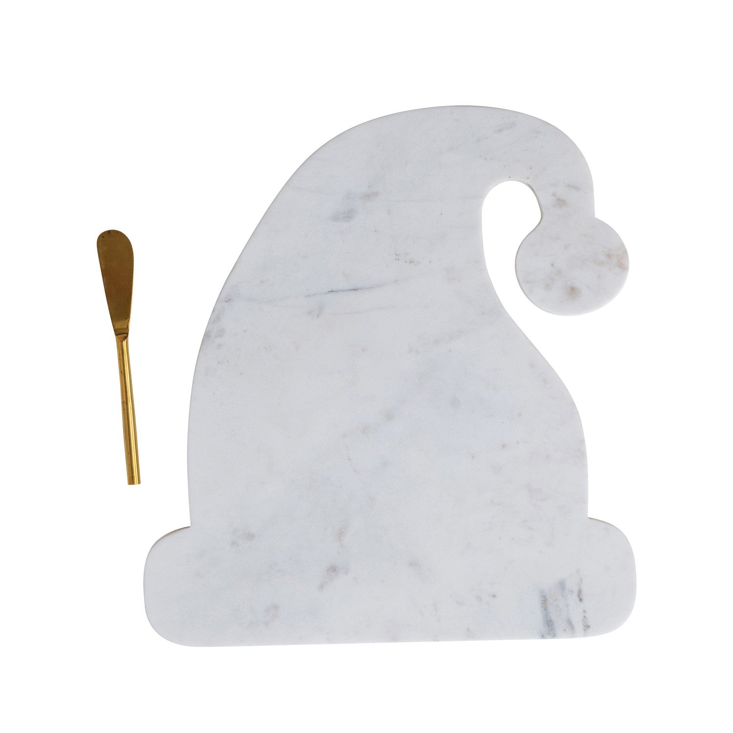 Catalog Name: 13-1/2"L x 12-1/2"W Marble Santa Hat Shaped Cheese/Serving Board w/ Stainless Steel Canape Knife, White & Gold Finish, Set of 2 Tied w/ Jute