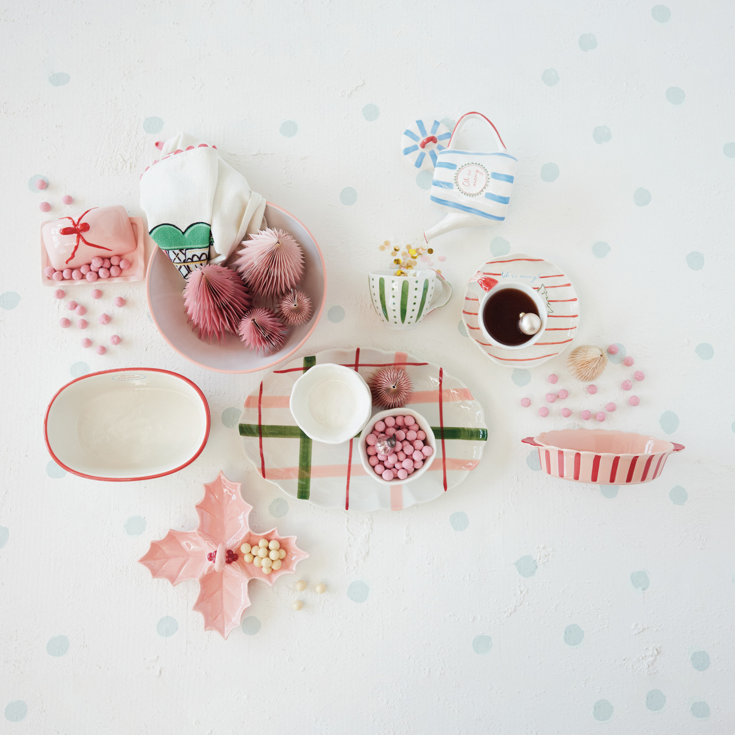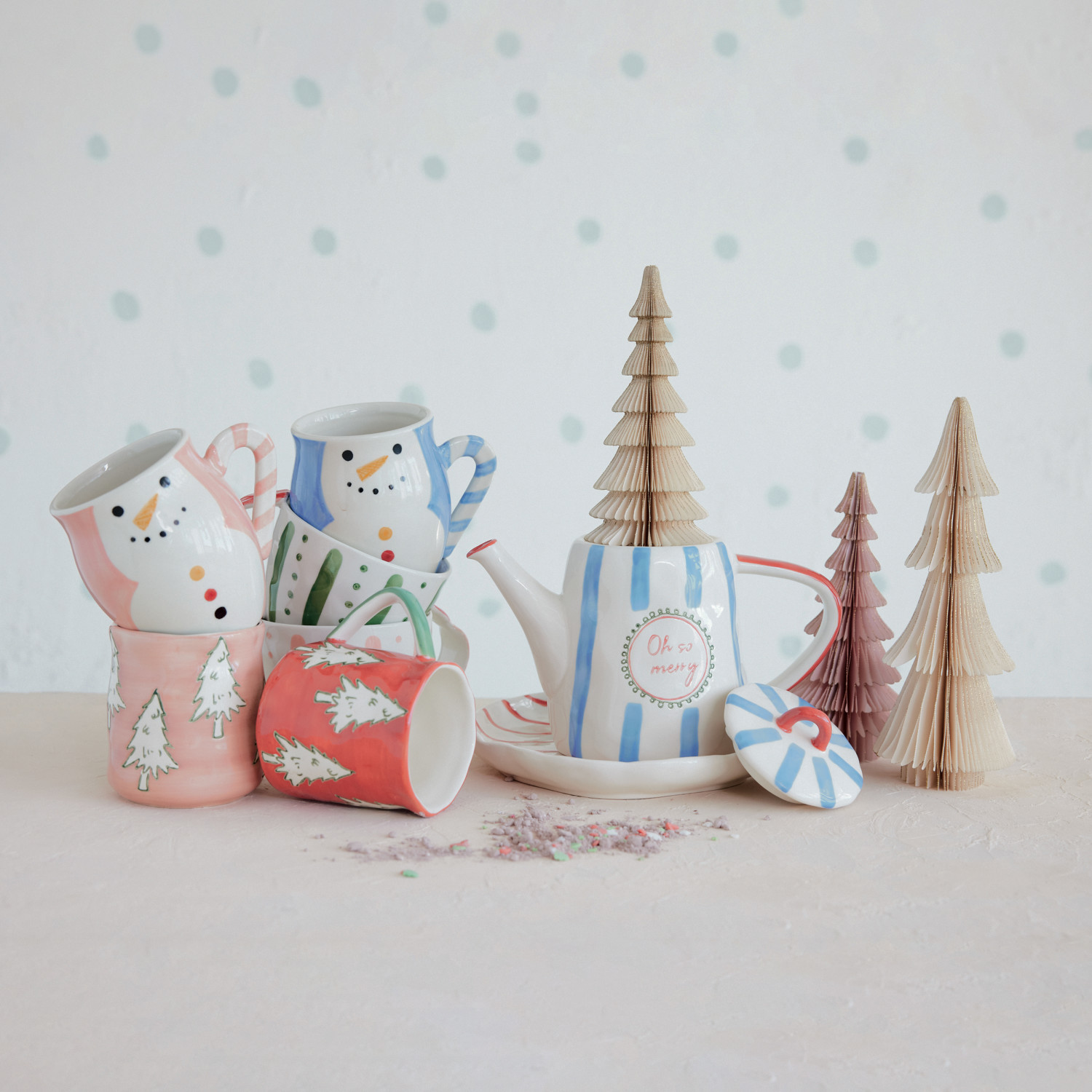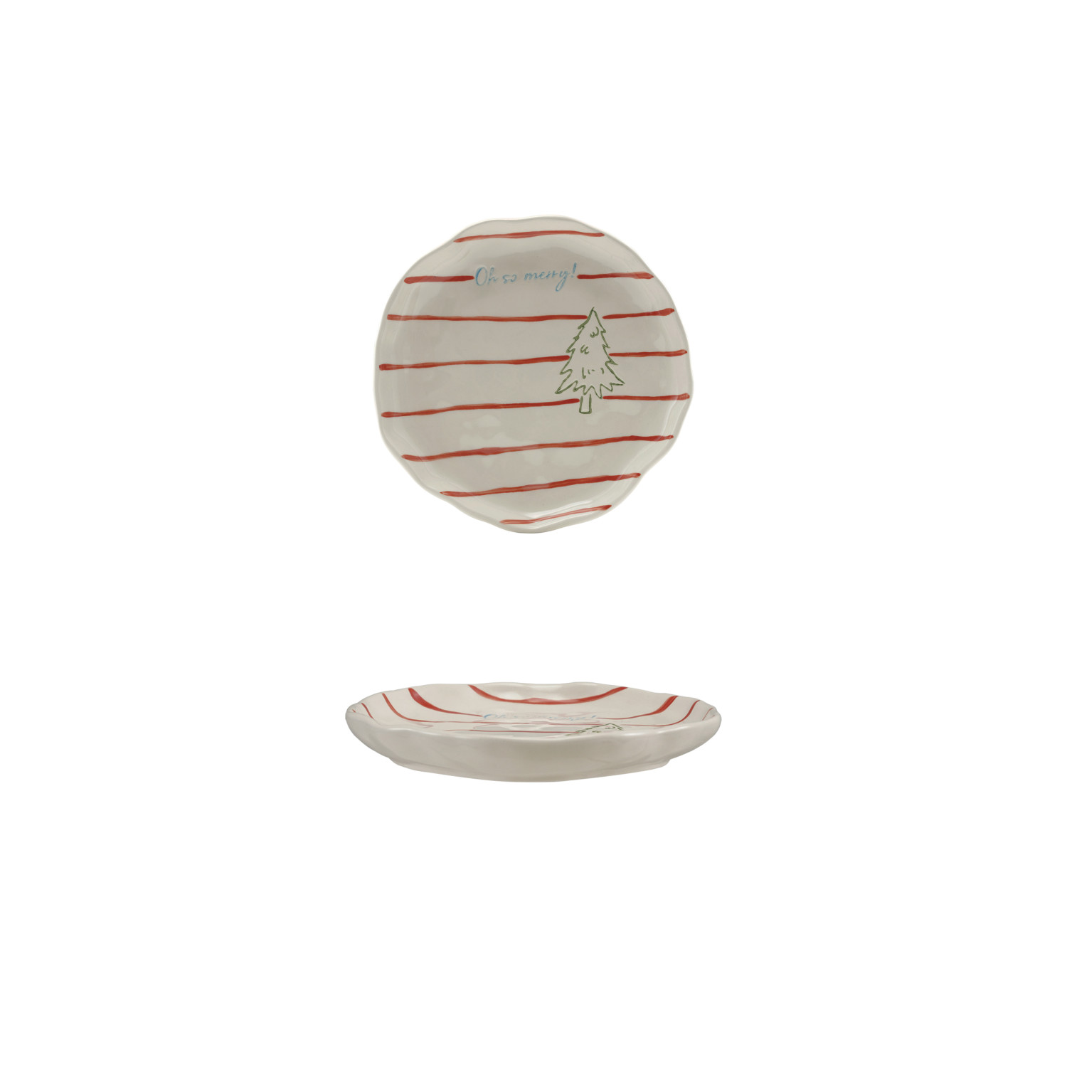 Catalog Name: 8" Round Hand-Painted Stoneware Organic Shaped Striped Plate w/ Wax Relief Tree "Oh so merry!", White, Red, Green & Blue