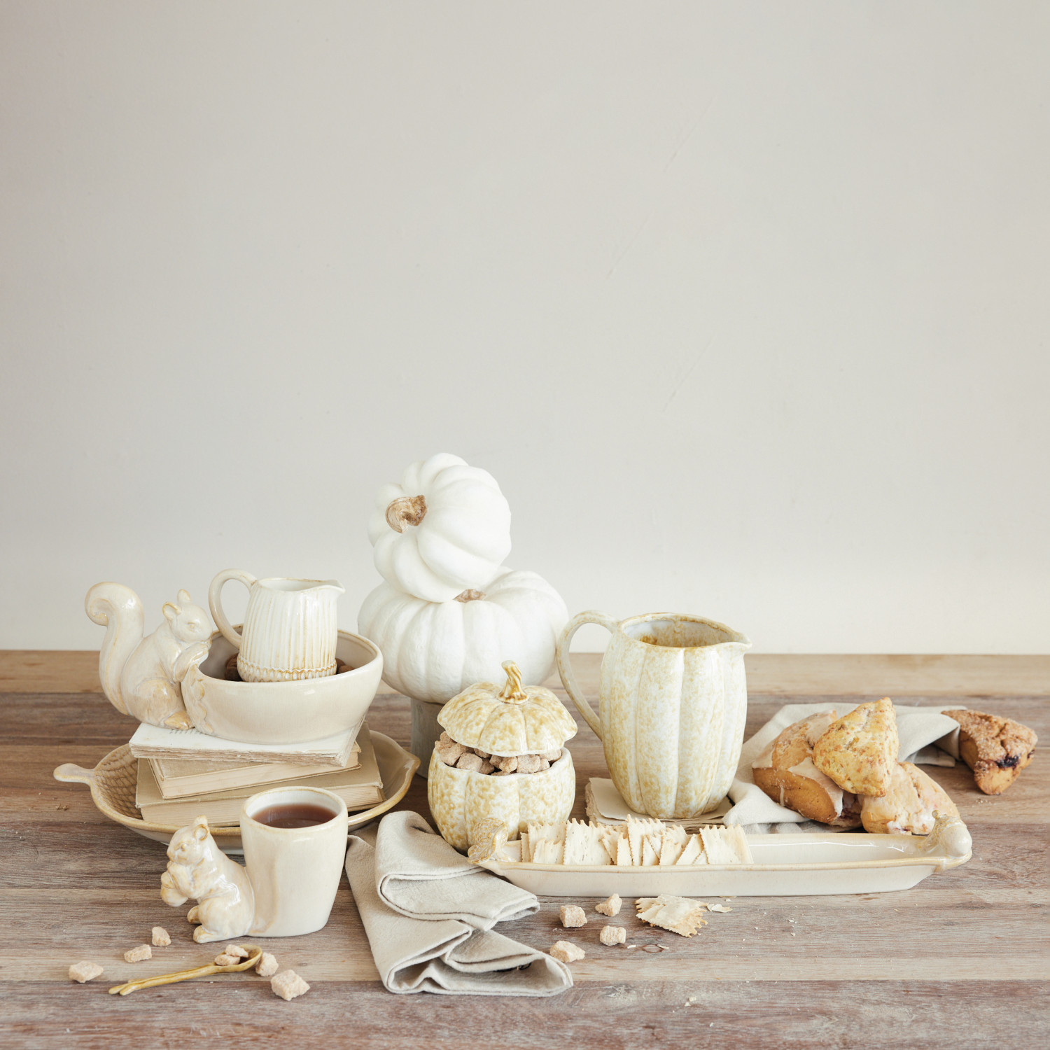 Catalog Name: 5" Round x 6"H Stoneware Pumpkin Shaped Jar w/ Lid, Reactive Glaze, Cream Color (Each One Will Vary)