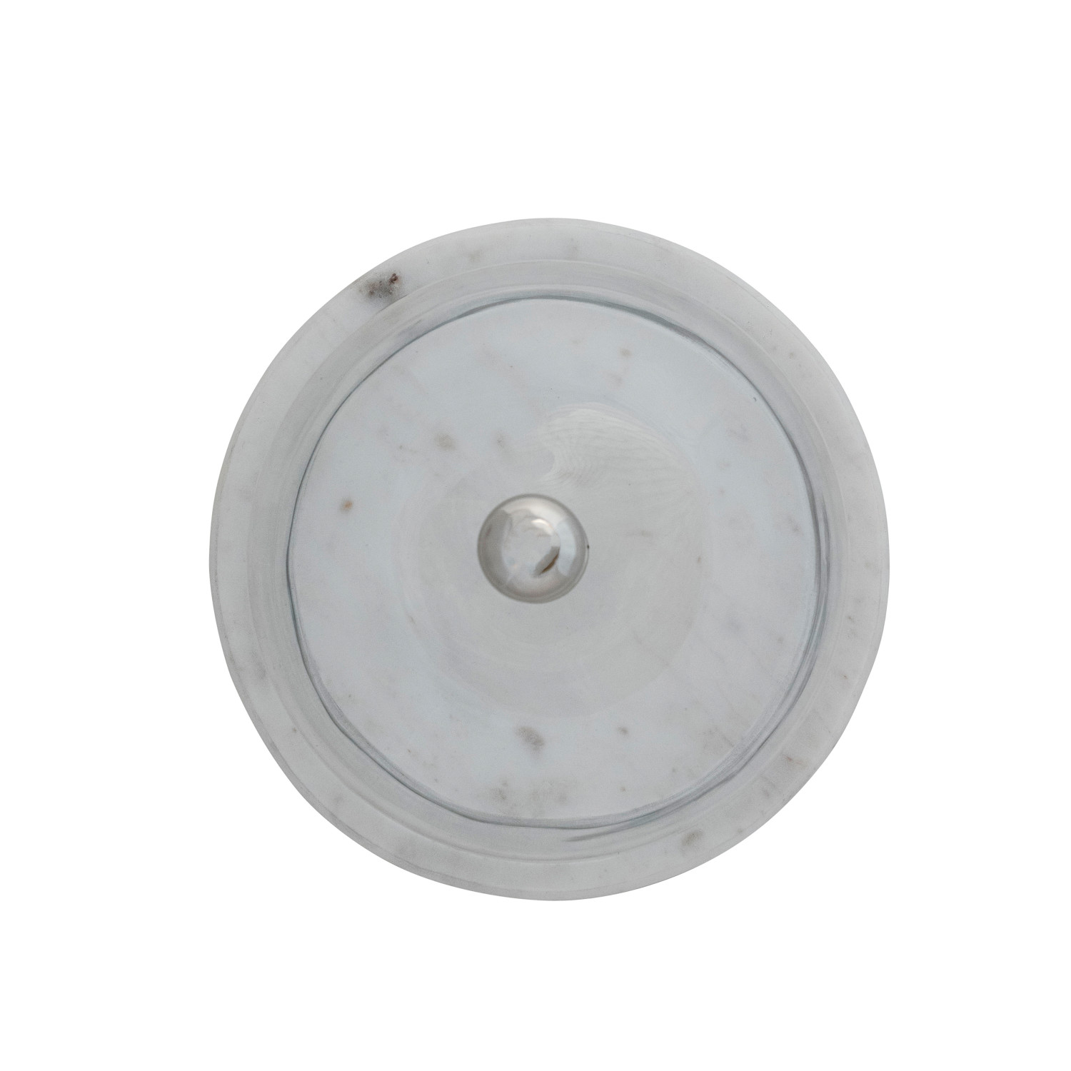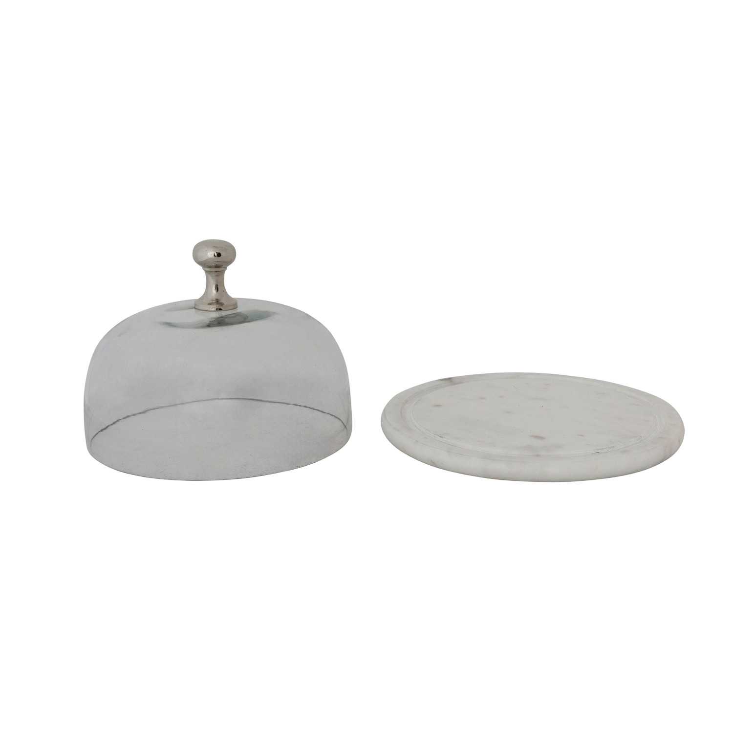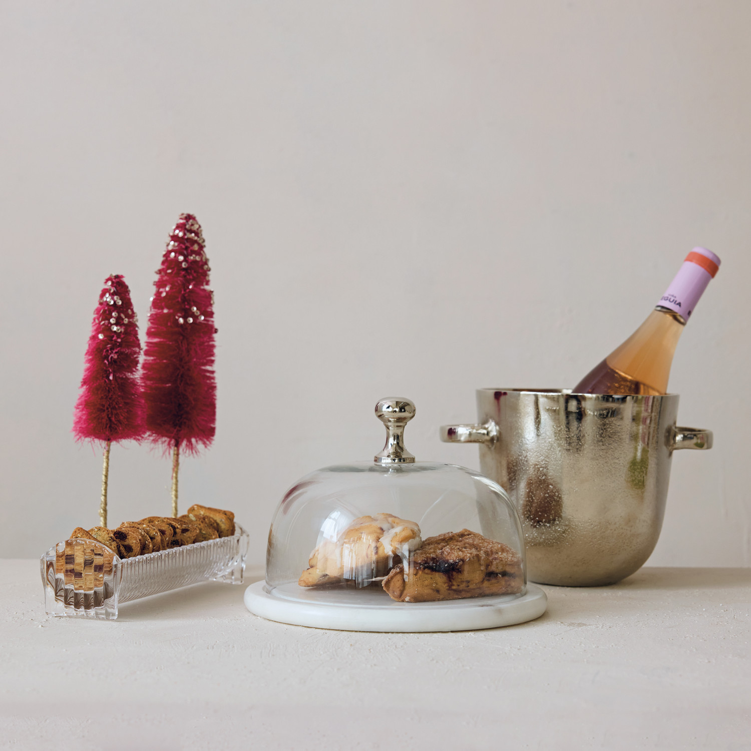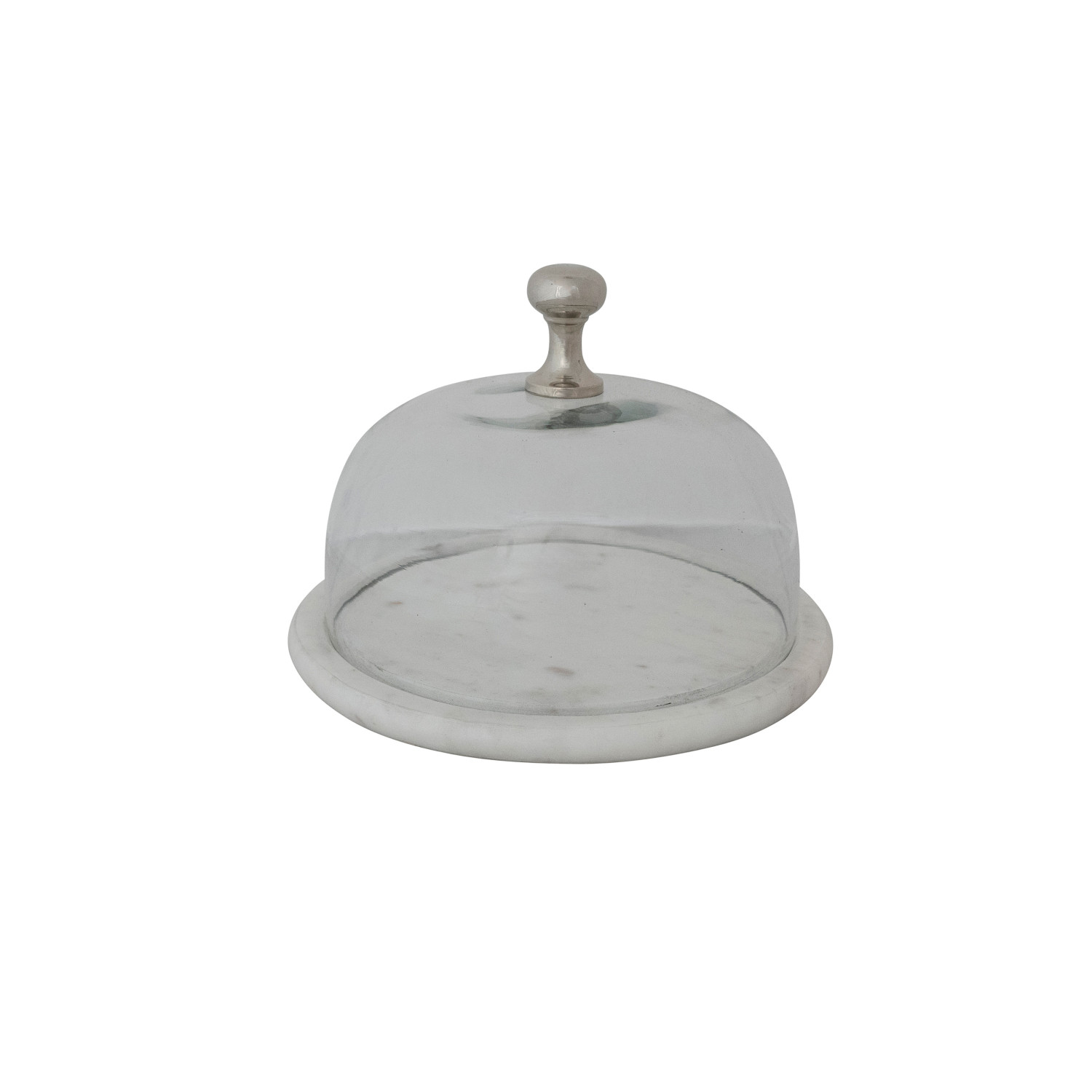 Catalog Name: 9" Round x 6-1/2"H Glass Cloche w/ Marble Base & Aluminum Handle, White & Nickel Finish, Set of 2