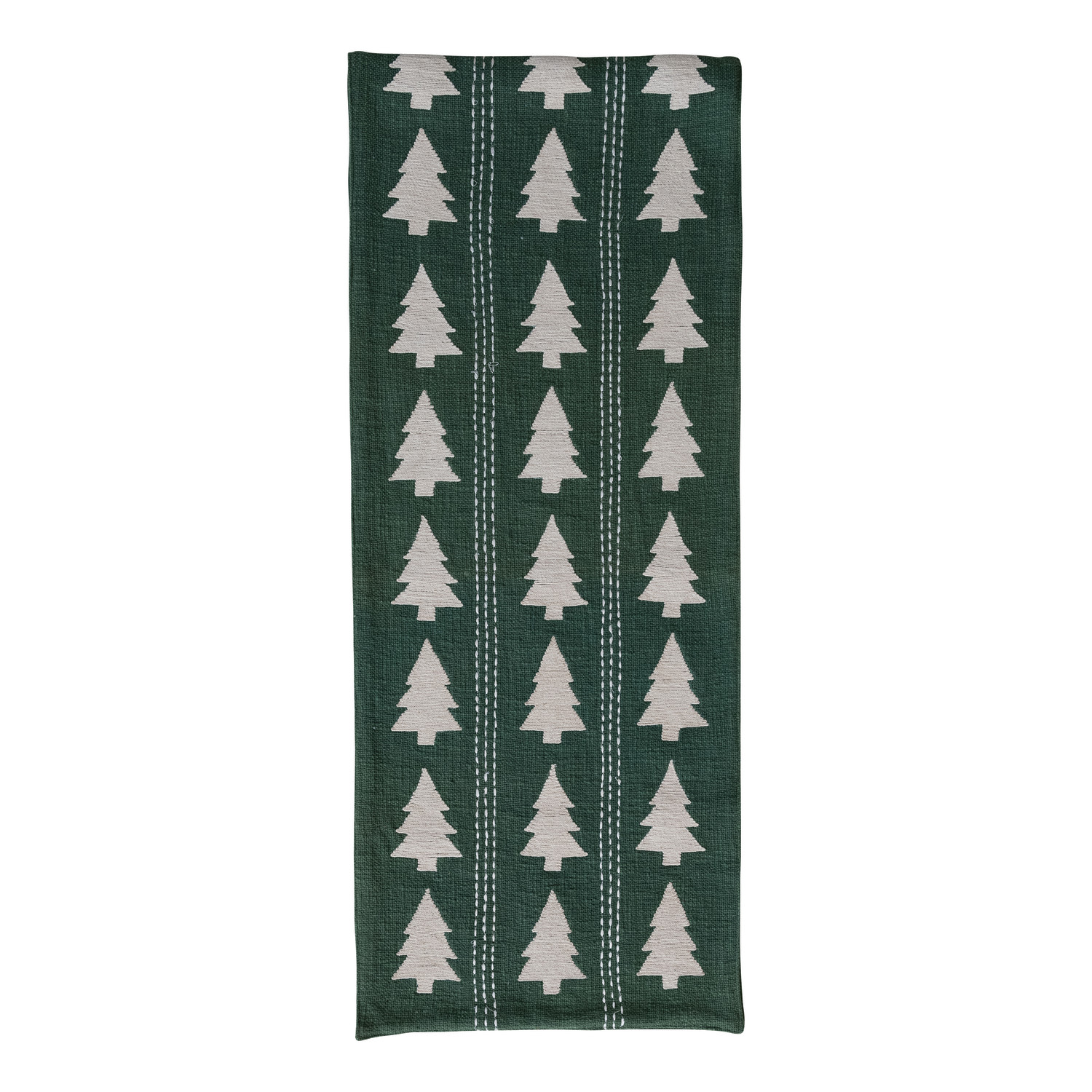 Catalog Name: 72"L x 14"W Cotton Slub Table Runner w/ Trees Pattern, Embroidery & Stitching, Green & Natural