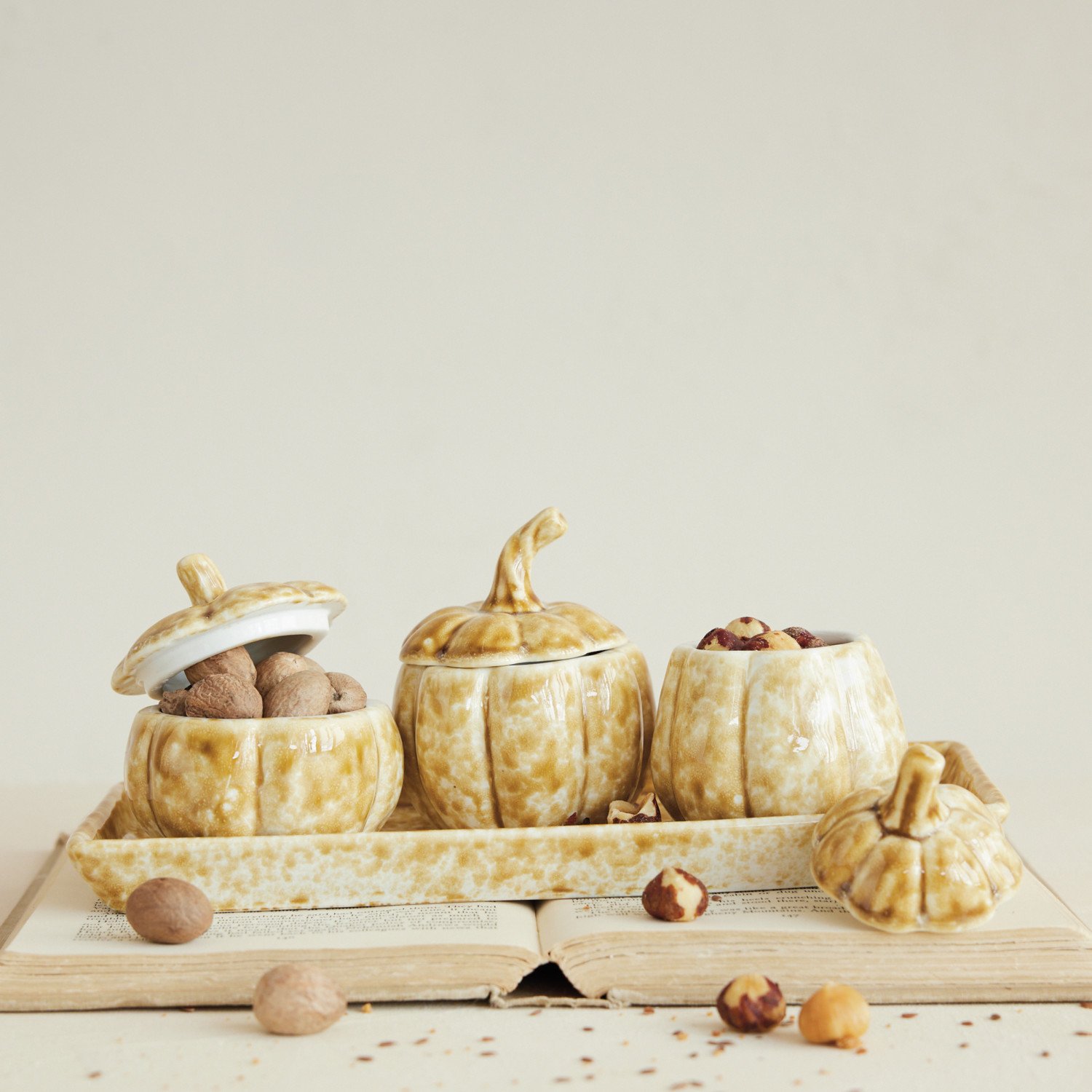 Stoneware Tray with 3 Pumpkin Shaped Jars, Brown, Set of 4 (Each One Will Vary)