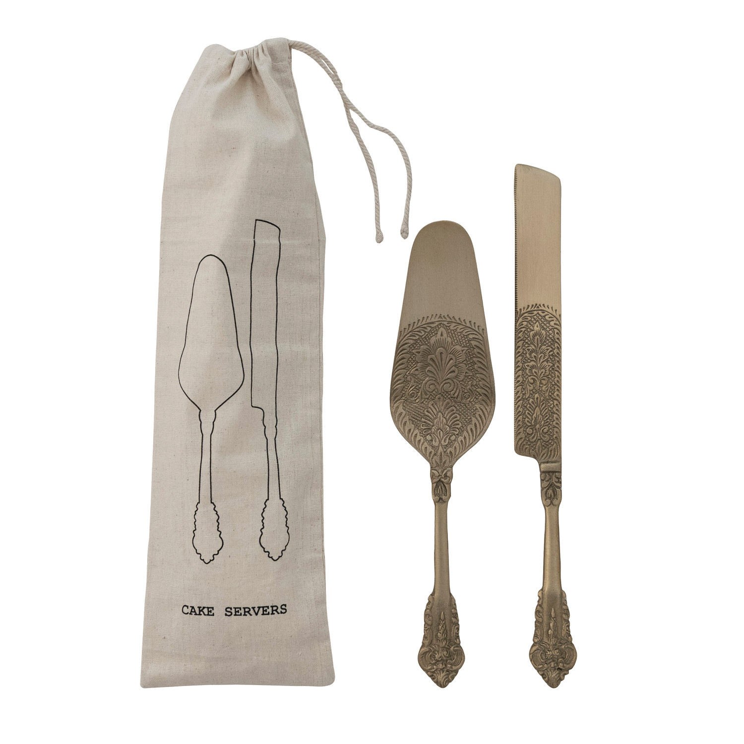 Embossed Brass Cake Servers, Set of 2 in Printed Drawstring Bag