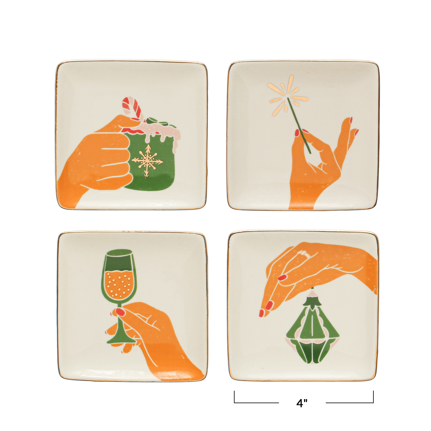 4" Square Stoneware Dish w/ Gold Electroplating, Hand & Ornament/Beverage, 4 Styles