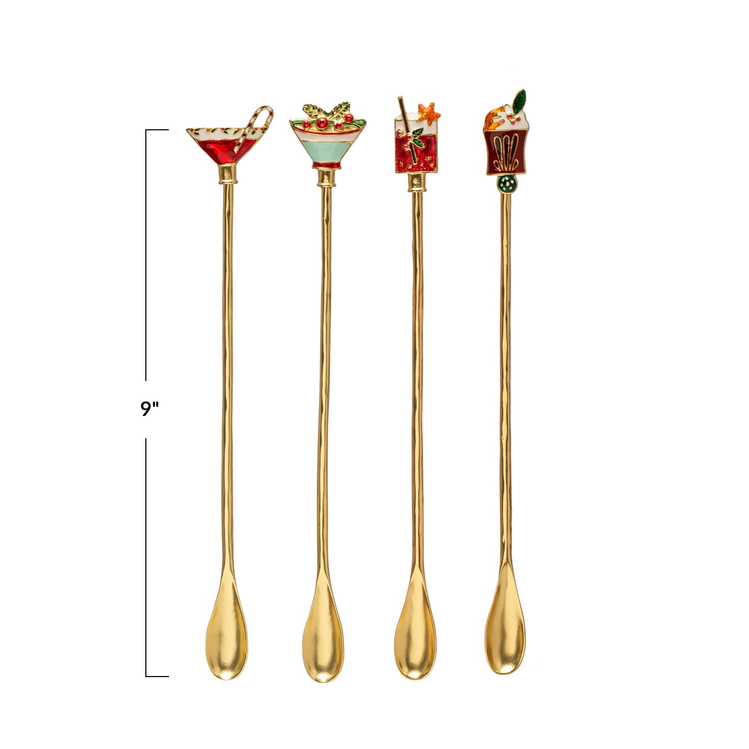 9"L Zinc Alloy Cocktail Spoon w/ Enameled Beverage Icon Handle, Multi Color, 4 Styles
