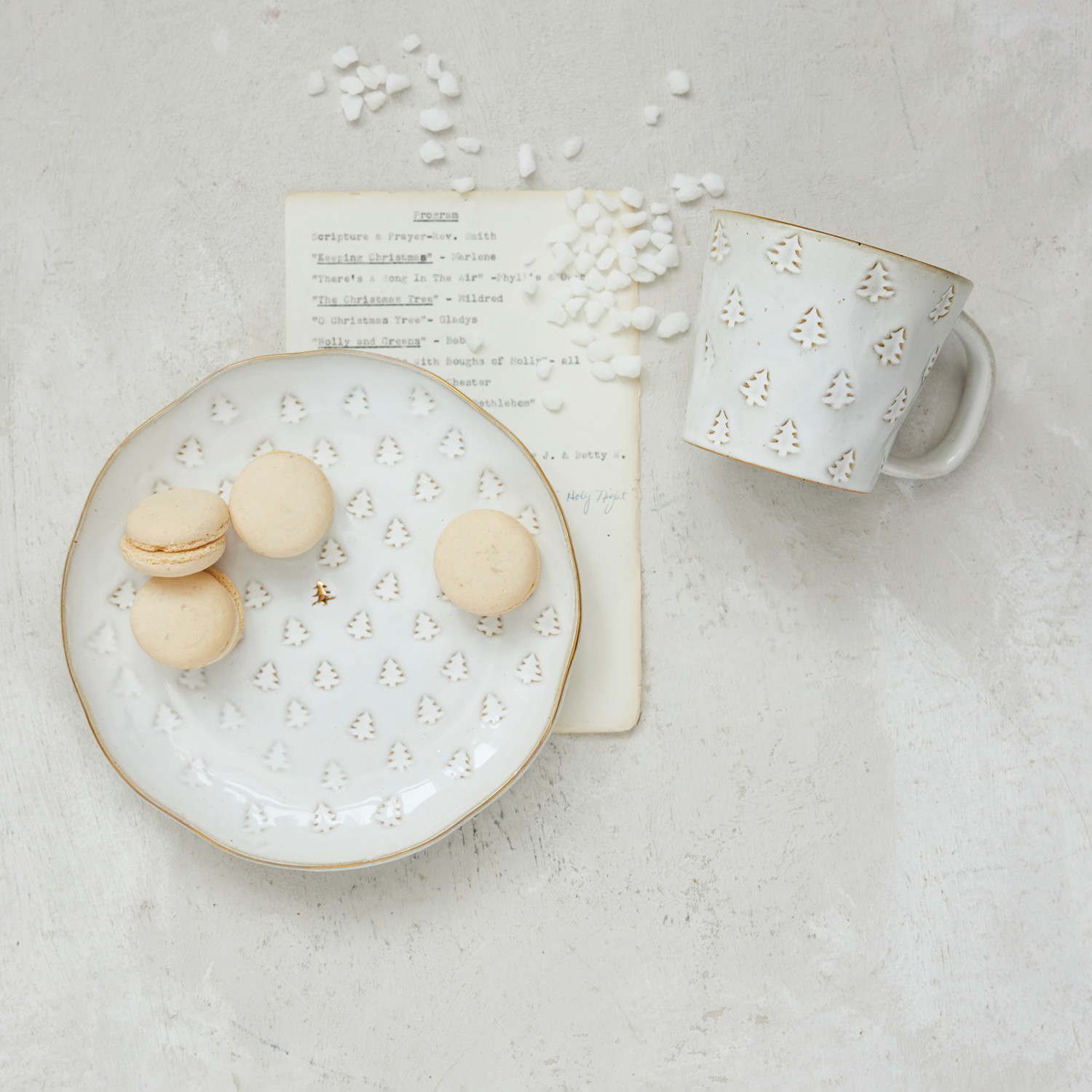 Catalog Name: 6" Round Debossed Stoneware Plate w/ Trees & Gold Electroplating, Reactive Glaze, White (Each One Will Vary)
