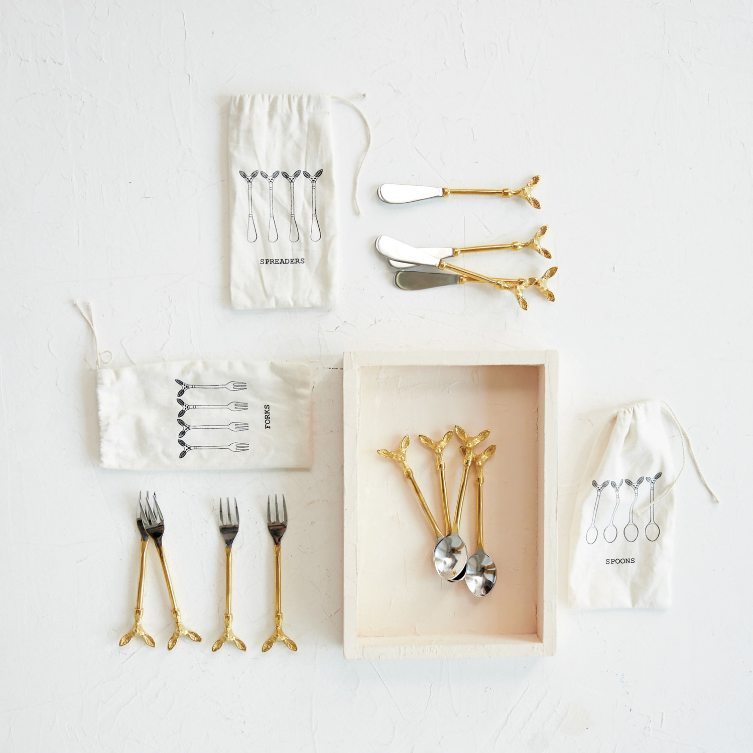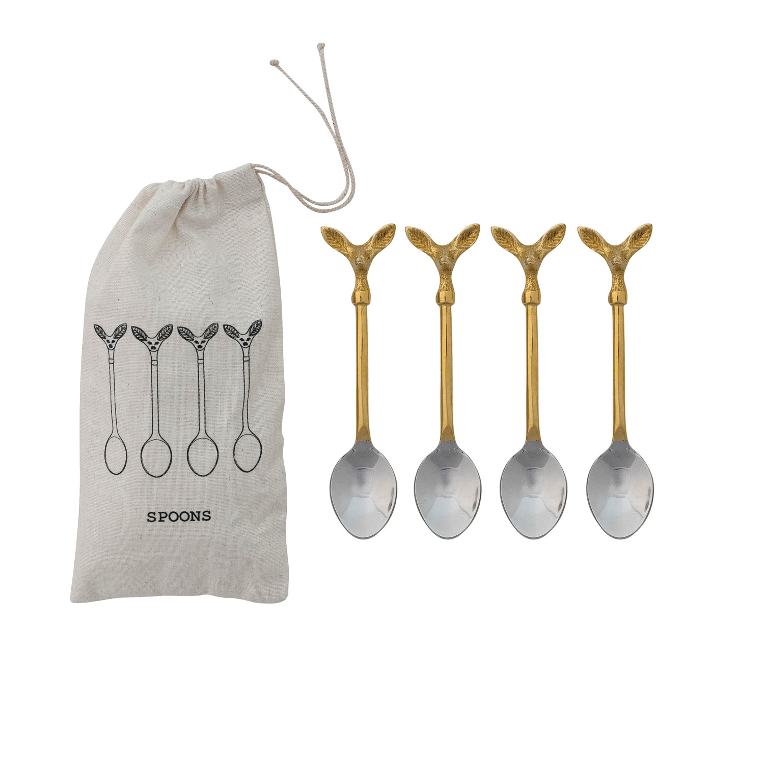 Catalog Name: 5-1/4"L Stainless Steel & Brass Coffee Spoons w/ Deer Head Handles, Set of 4 in Printed Drawstring Bag