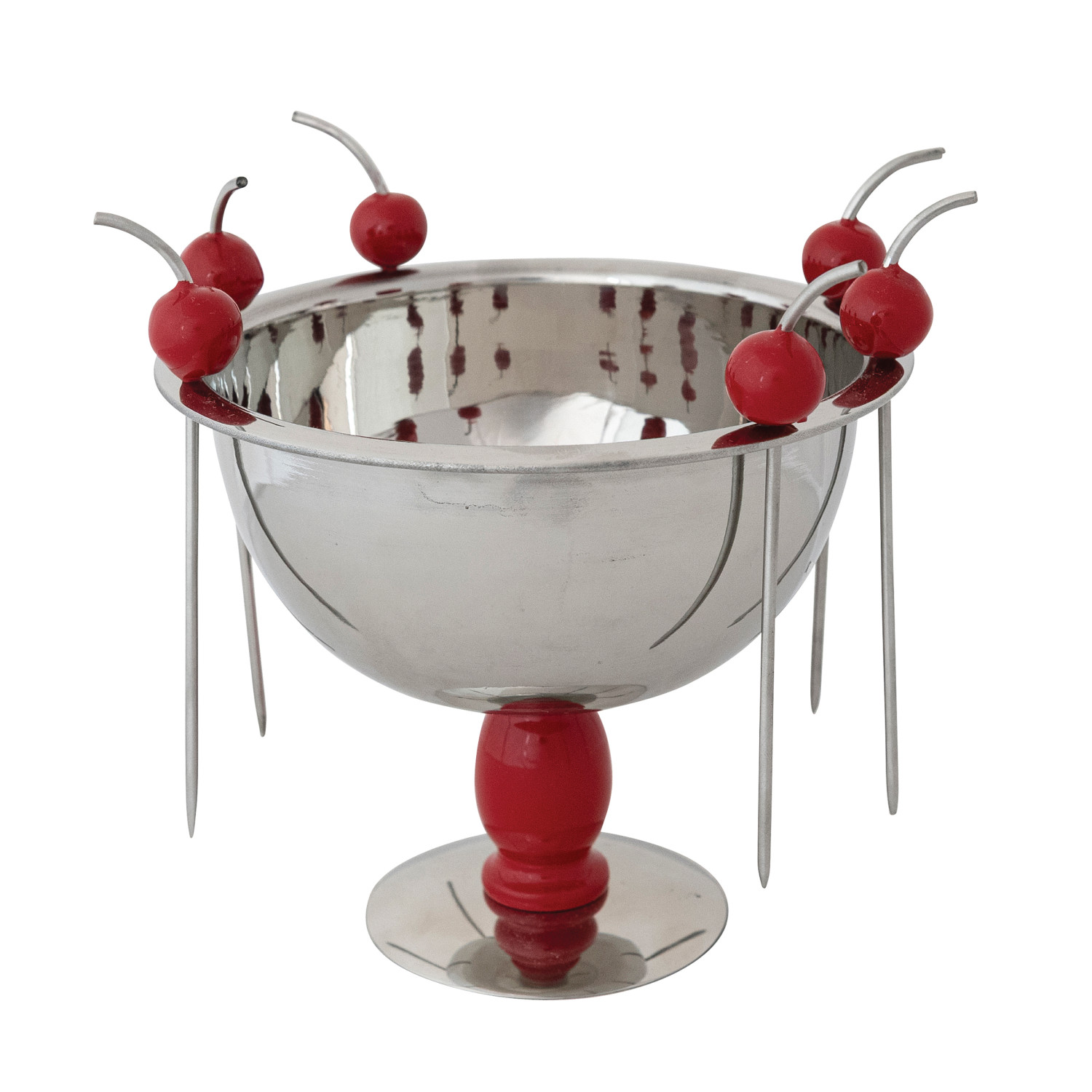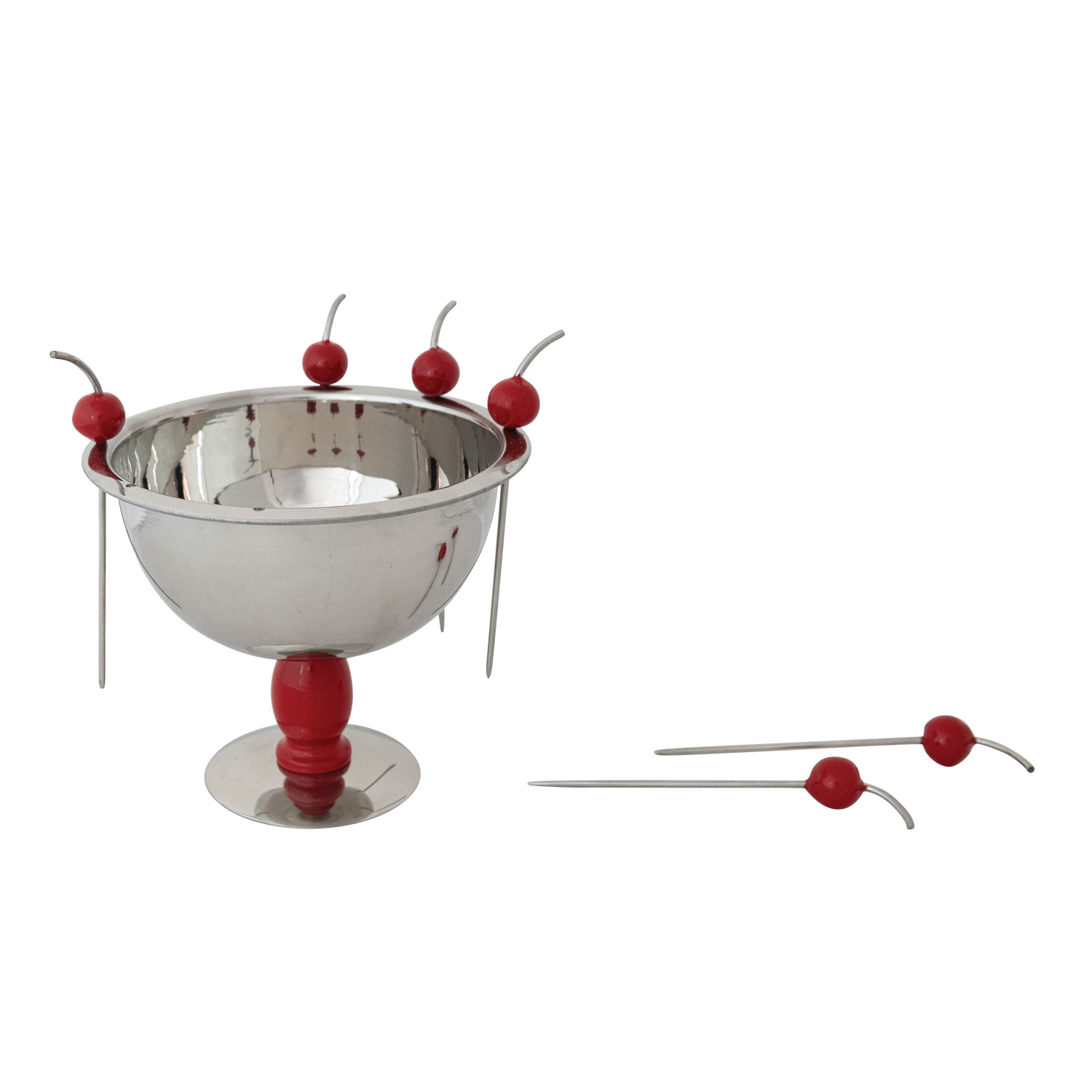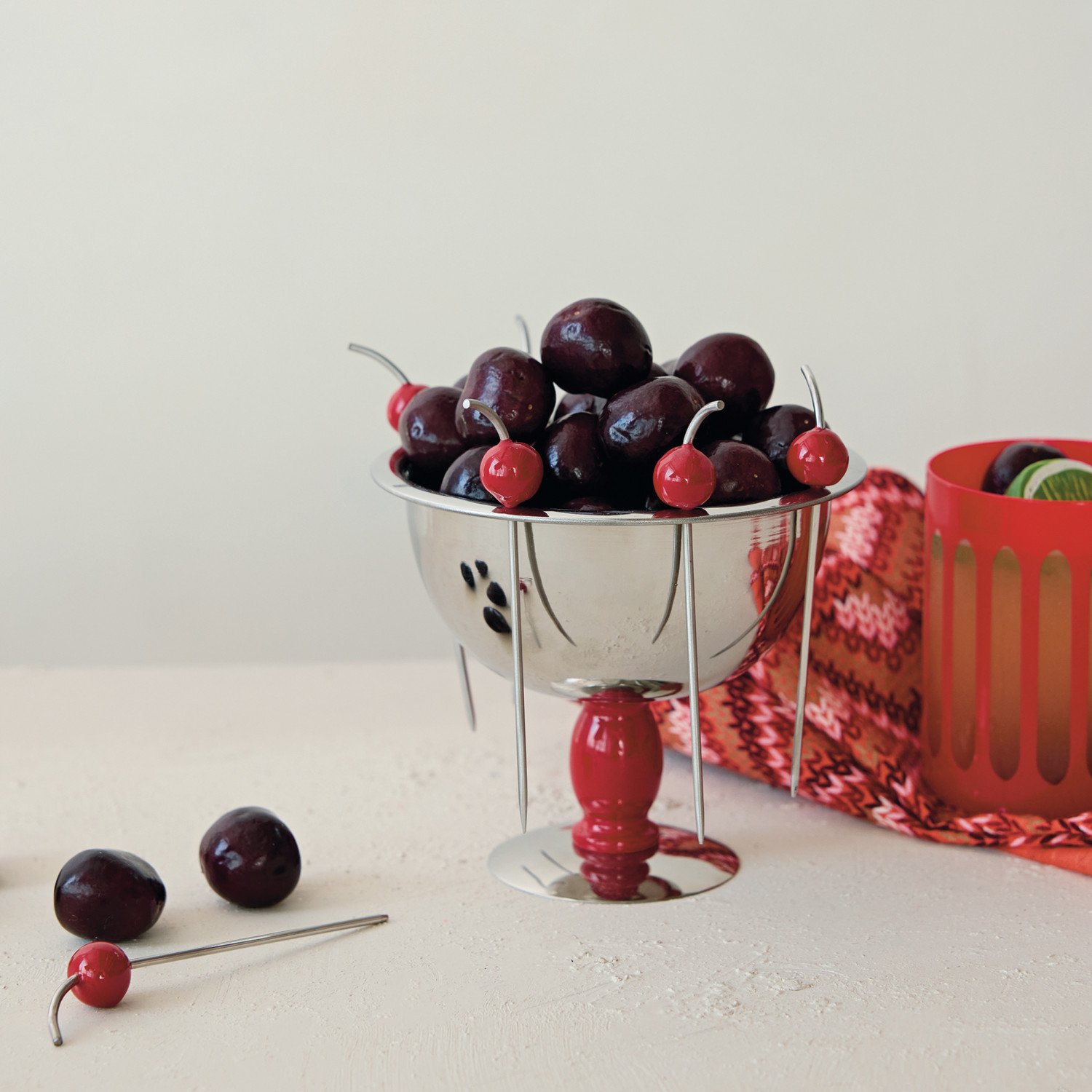 Catalog Name: 5-3/4" Round x 4-3/4"H Enameled Stainless Steel Footed Bowl w/ (6) 4-3/4"L Cherry Shaped Appetizer Picks on Rim, Red, Set of 7