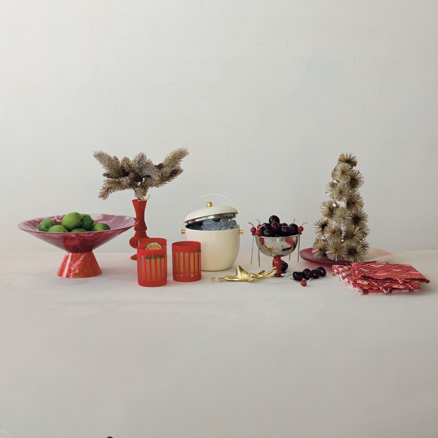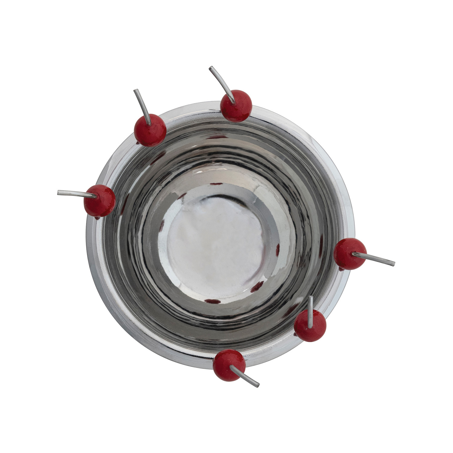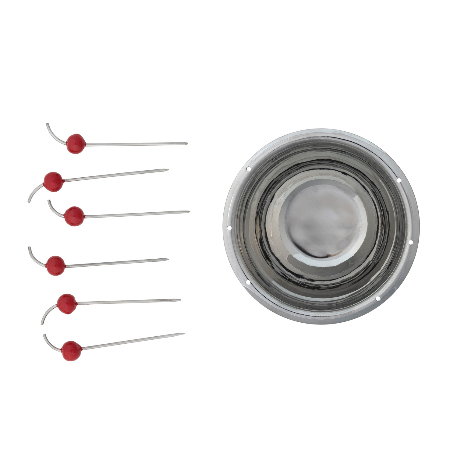 Catalog Name: 5-3/4" Round x 4-3/4"H Enameled Stainless Steel Footed Bowl w/ (6) 4-3/4"L Cherry Shaped Appetizer Picks on Rim, Red, Set of 7