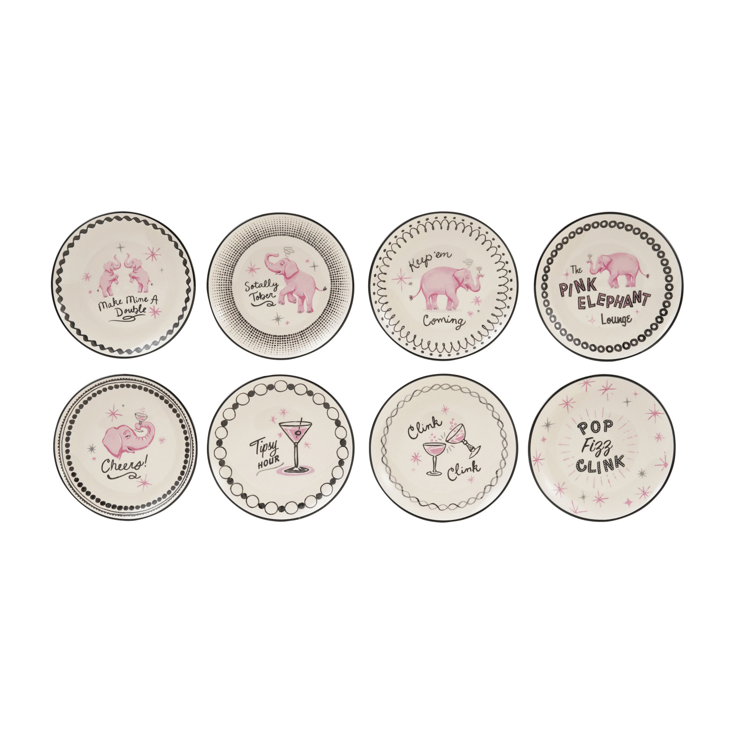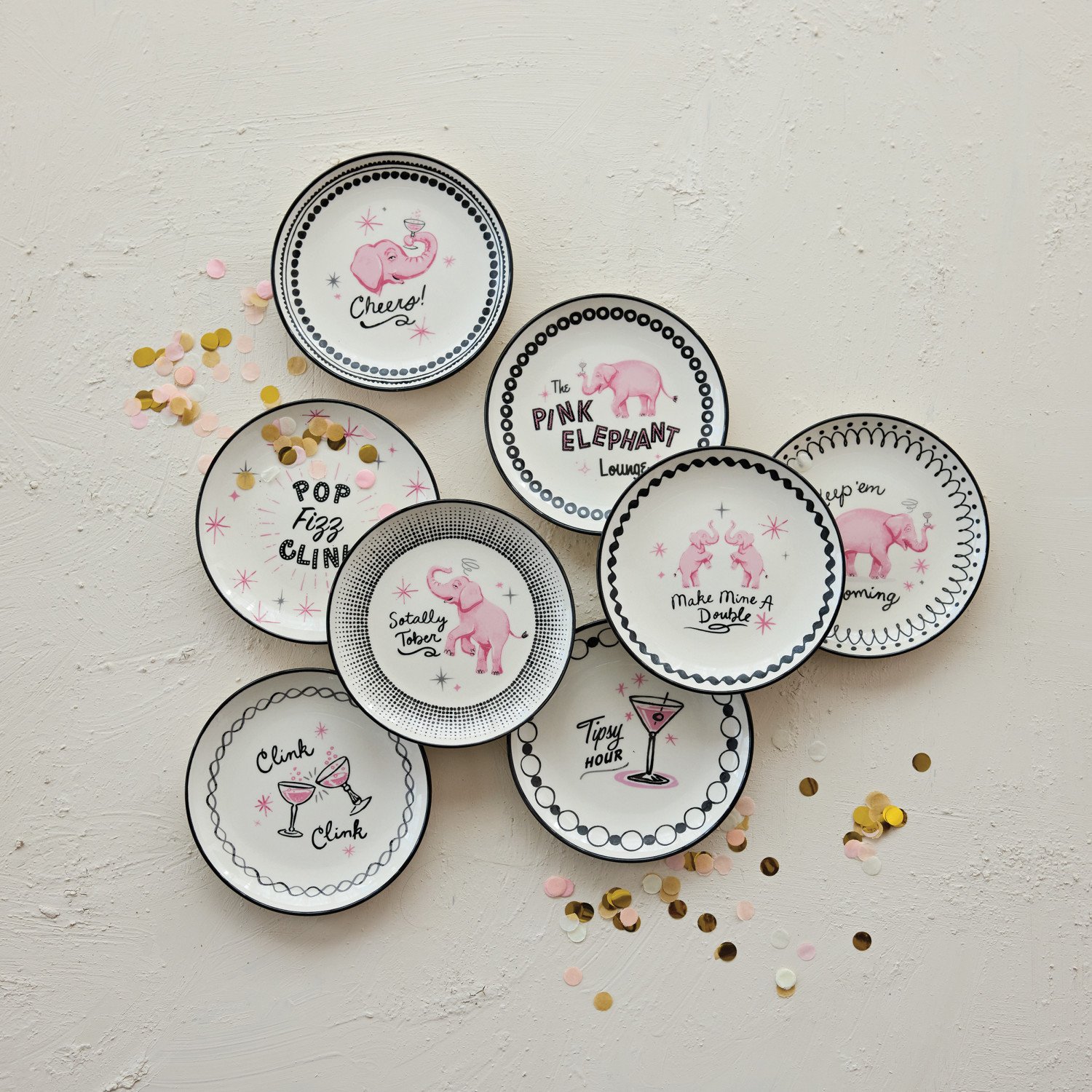 Catalog Name: 5" Round Hand-Painted Stoneware Dish w/ Pink Elephants/Cocktail Glasses & Saying, Multi Color, 8 Styles ©