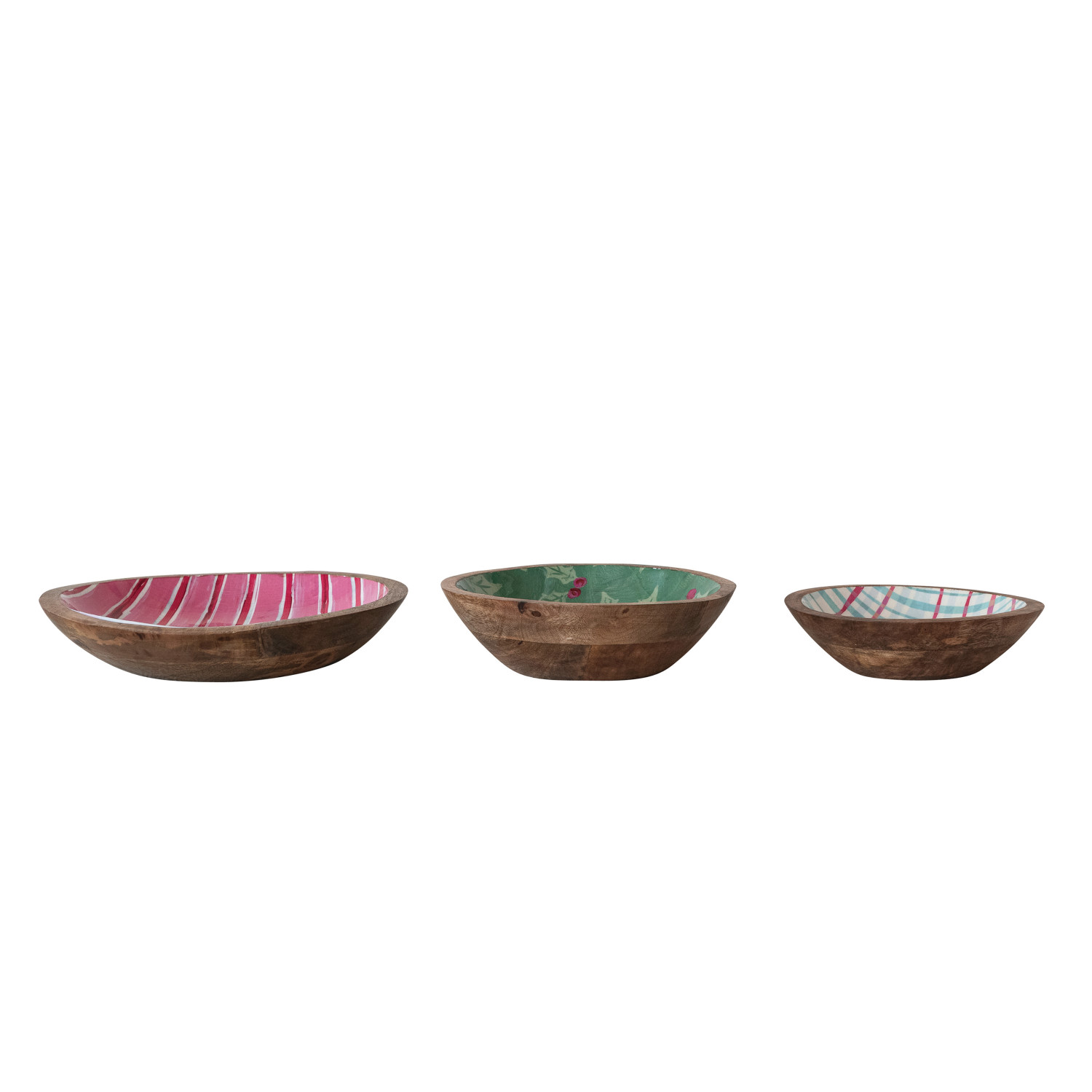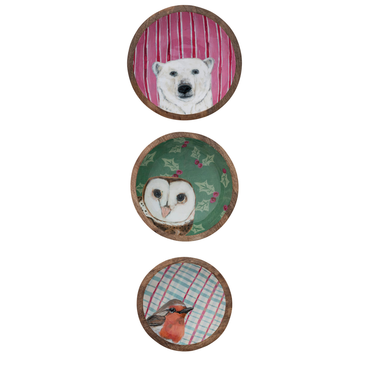 Enameled Mango Wood Bowls with Holiday Patterns & Animals, Set of 3 ©