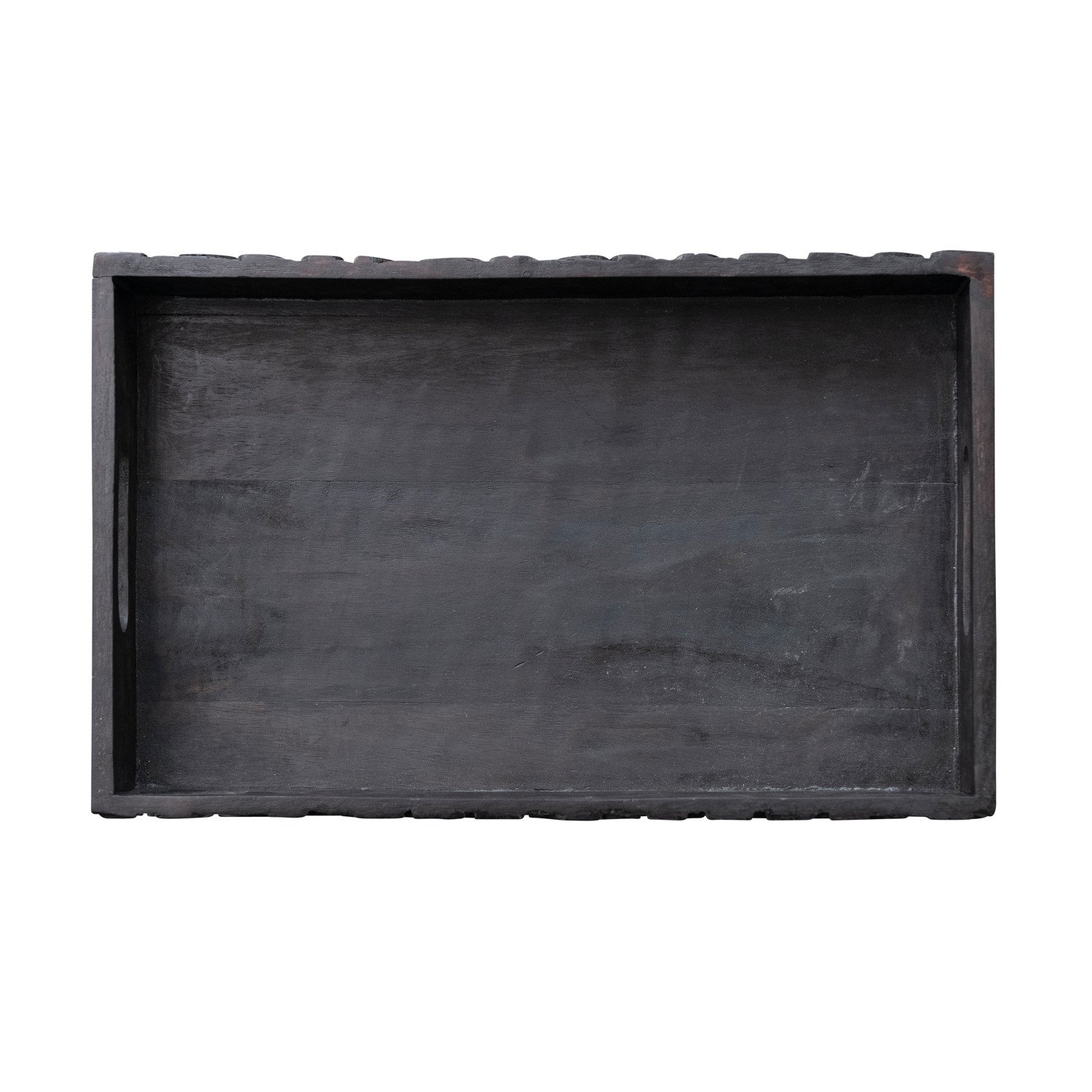 Catalog Name: 11"L x 5-1/4"W x 5-3/4"H Hand-Carved Mango Wood Tray w/ Leaves & Handles, Espresso Finish