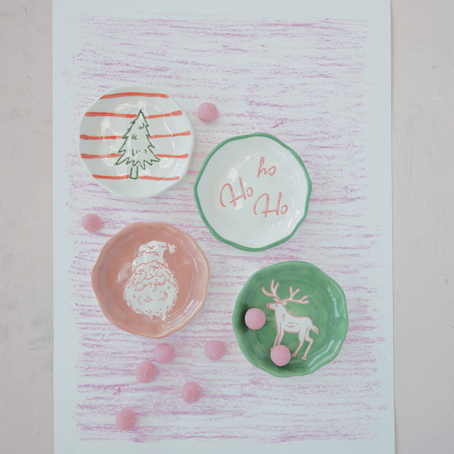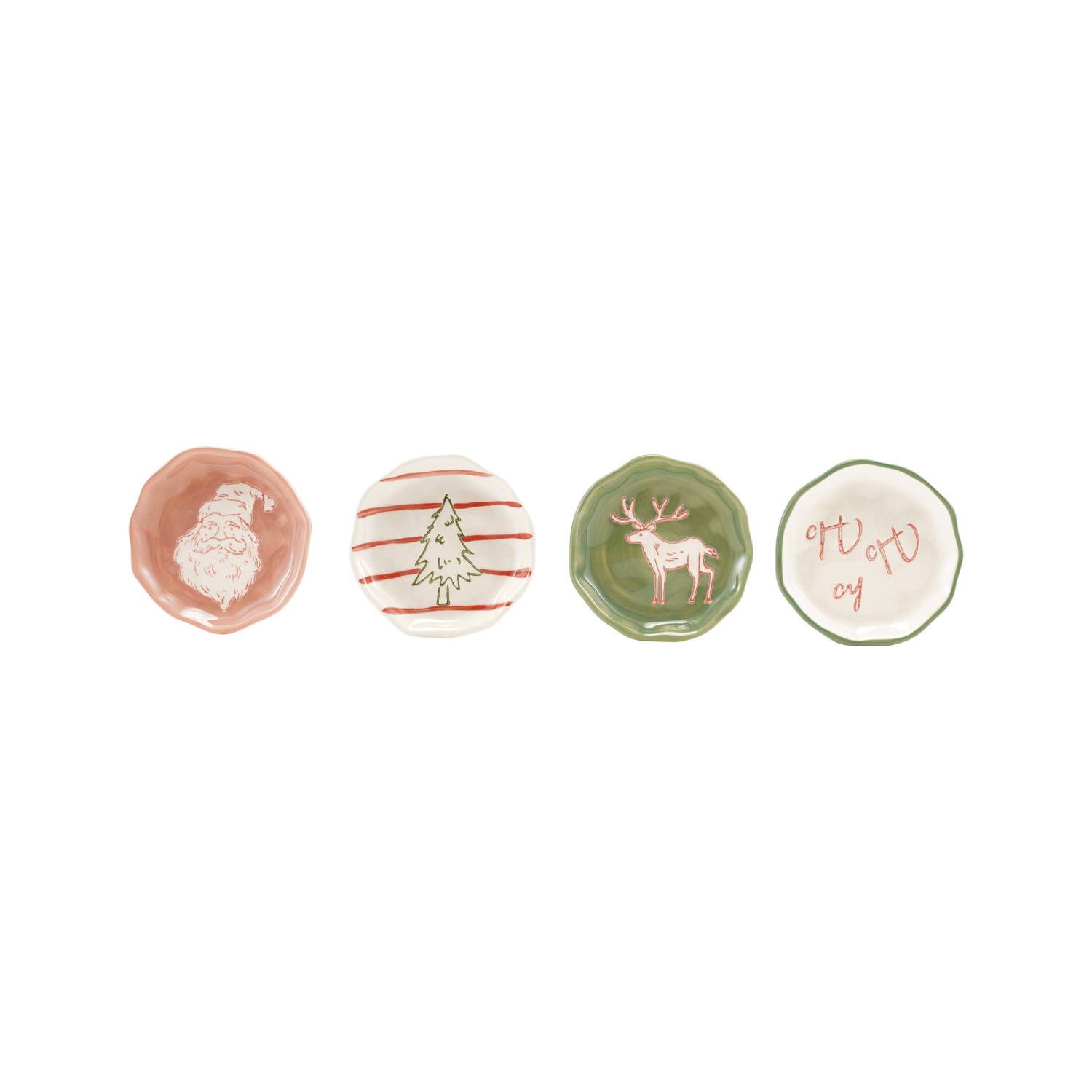 Catalog Name: 3-3/4" Round Stoneware Organic Shaped Dish w/ Wax Relief Holiday Image, Multi Color, 4 Styles