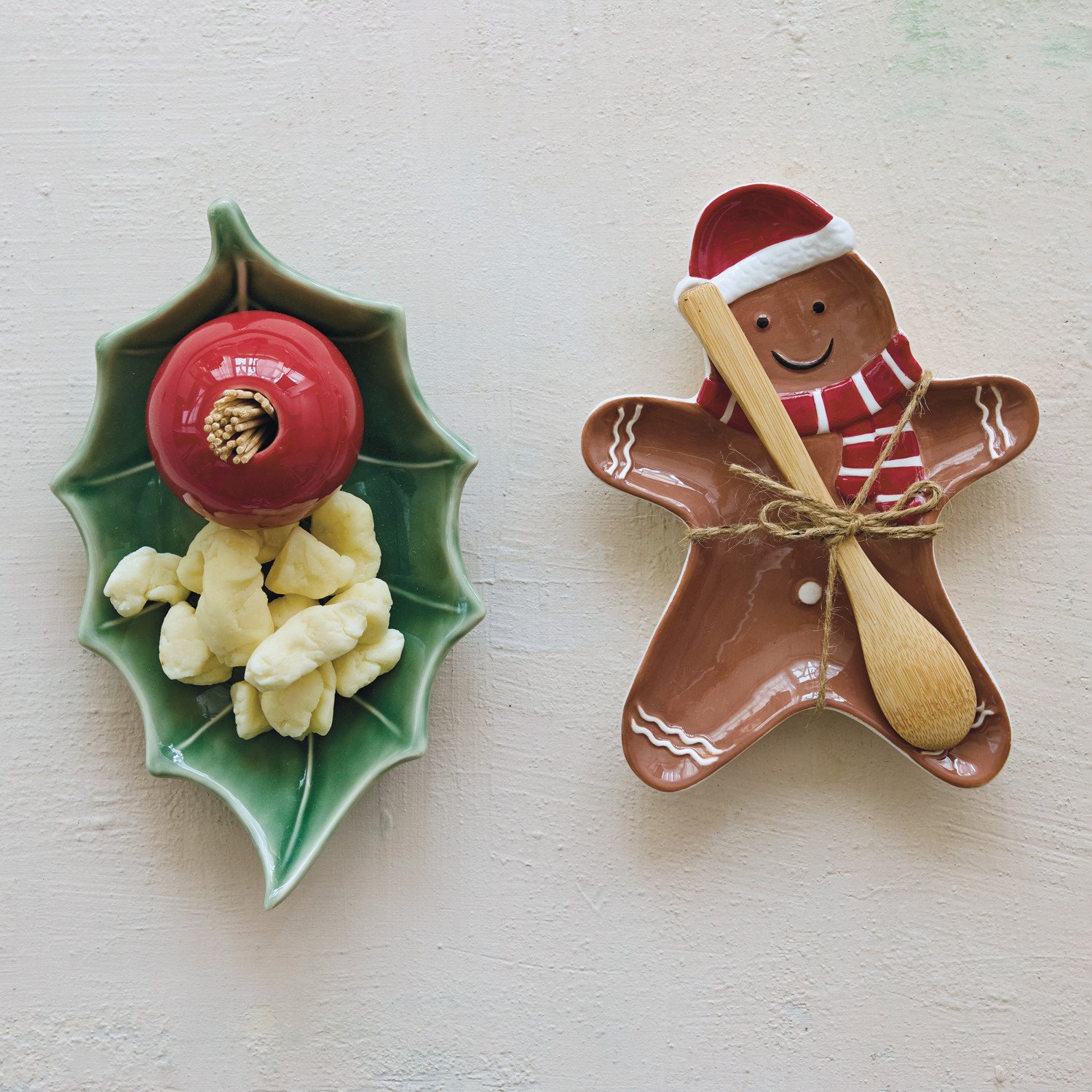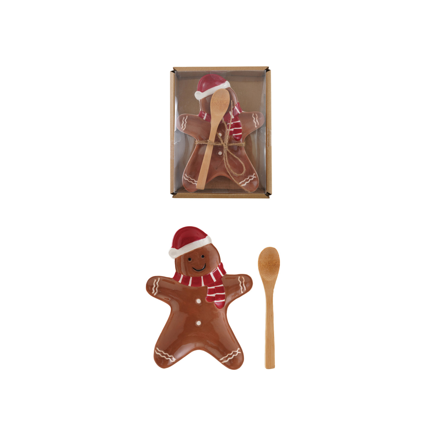 Ceramic Gingerbread Cookie Shaped Dish with Bamboo Spoon Tied with Jute, Boxed Set of 2