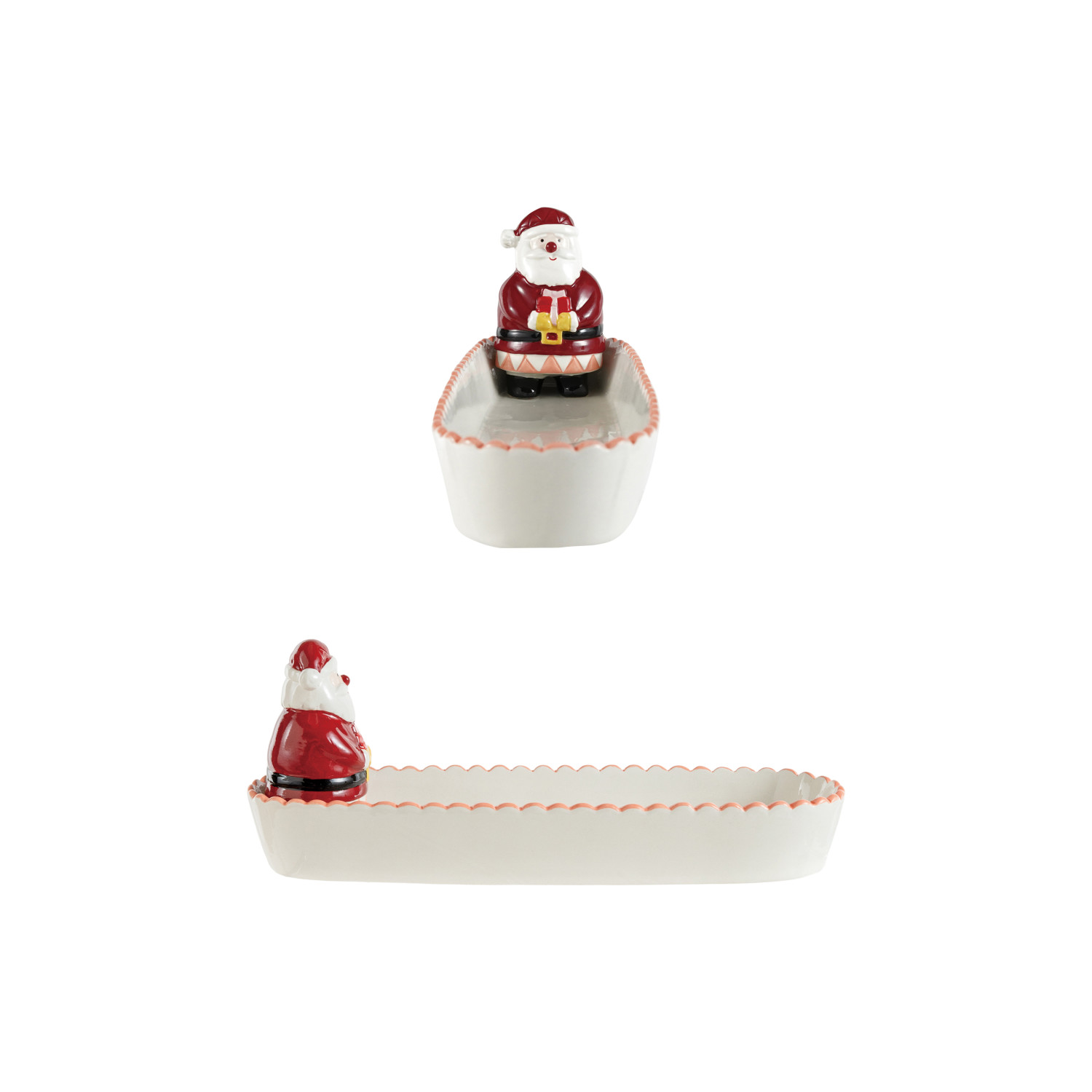 Catalog Name: 11-3/4"L x 3-3/4"W x 4"H Ceramic Scalloped Cracker Dish w/ 3D Santa, Red, White & Black ©