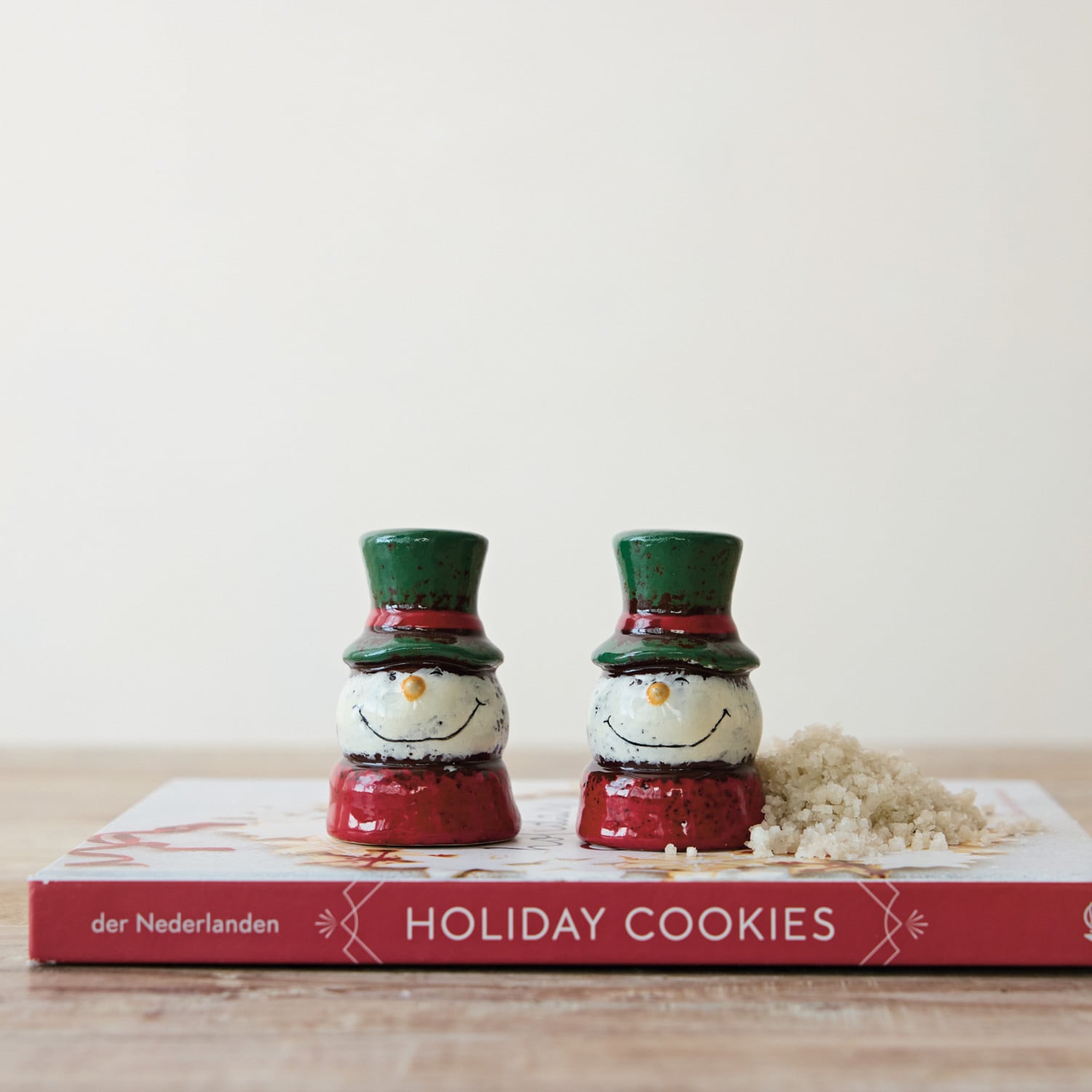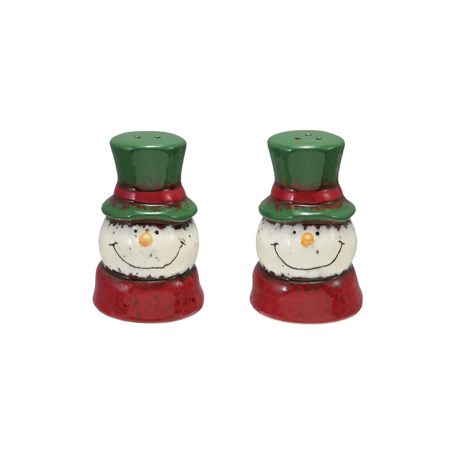 Catalog Name: 2-3/4"H Hand-Painted Ceramic Snowman Head Shaped Salt & Pepper Shakers, Reactive Glaze, Green, Red & White, Set of 2 (Each One Will Vary)