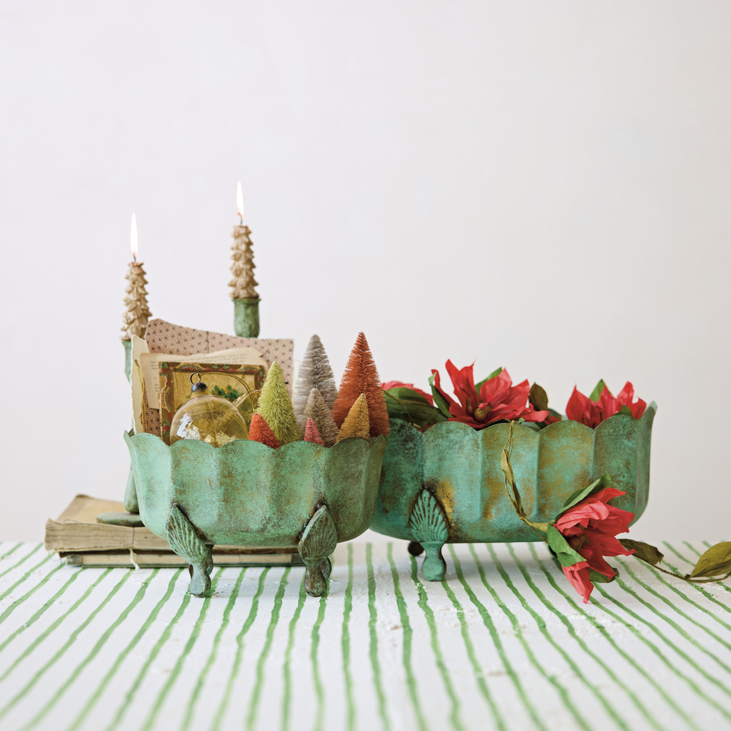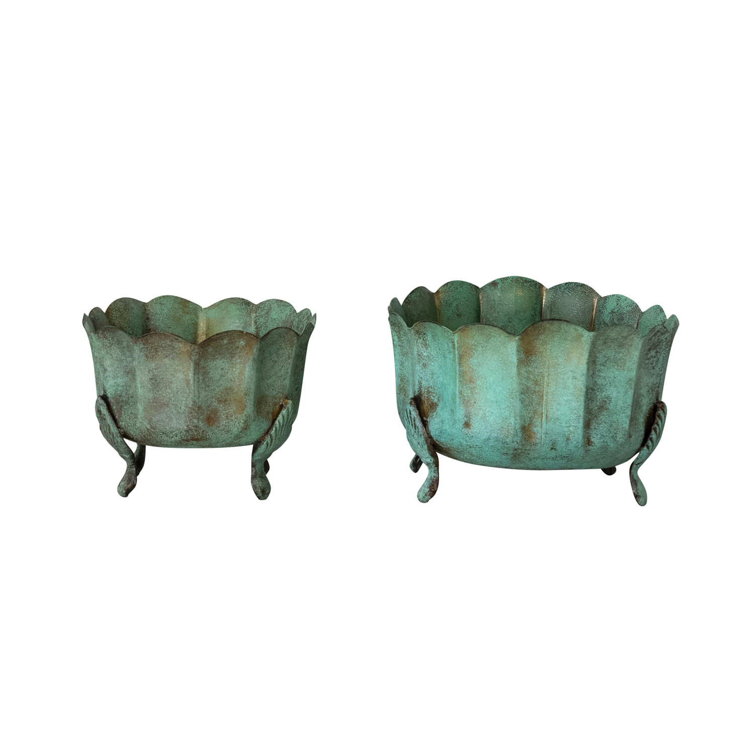 Metal Scalloped Footed Planters, Verdigris Finish, Set of 2