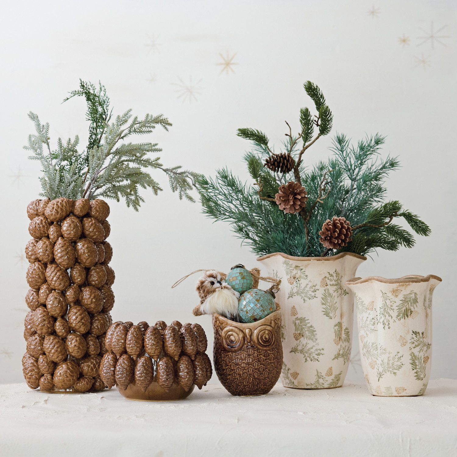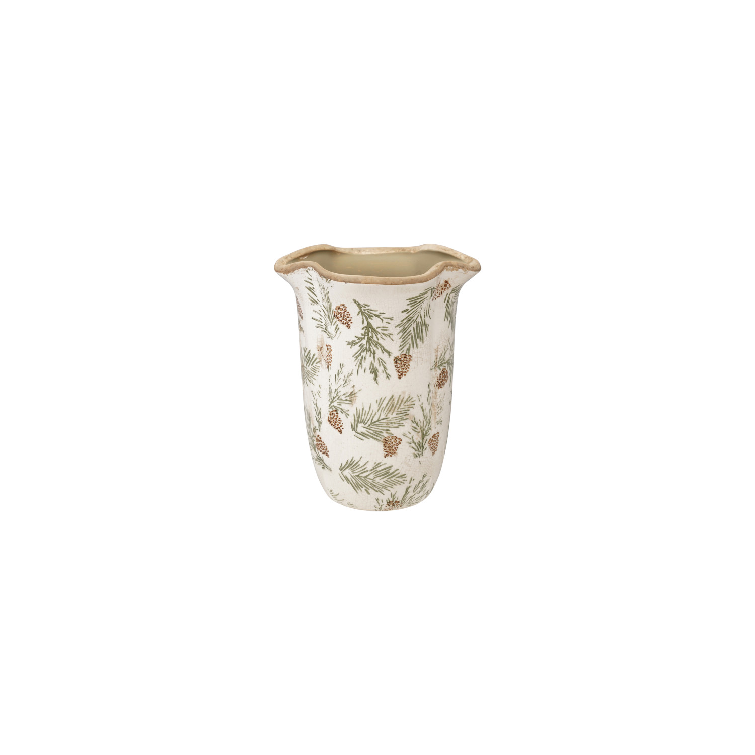 Catalog Name: 7-1/2" Round x 9-1/4"H Stoneware Scalloped Planter/Vase w/ Transferware Pine Bough Pattern, Crackle Glaze, Cream Color, Brown & Green (Each One Will Vary)