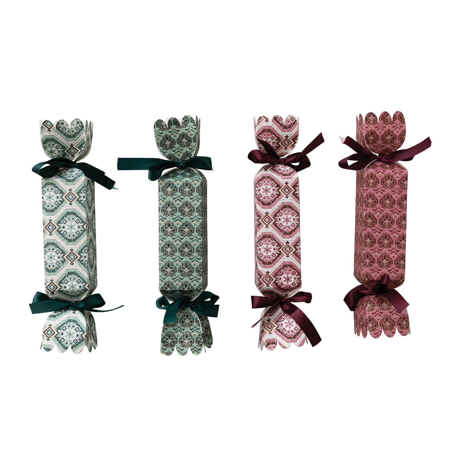 Catalog Name: 13-1/2"L x 2-1/2"W Handmade Recycled Block Printed Paper Candy Shaped Gift Box w/ Pattern & Ribbon Ties, Multi Color, 4 Styles