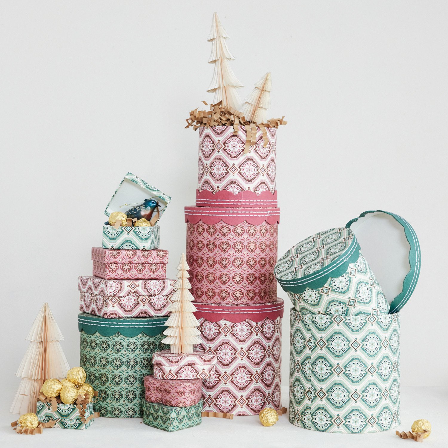 Handmade Recycled Block Printed Scalloped Paper Gift Bags with Patterns, Set of 3