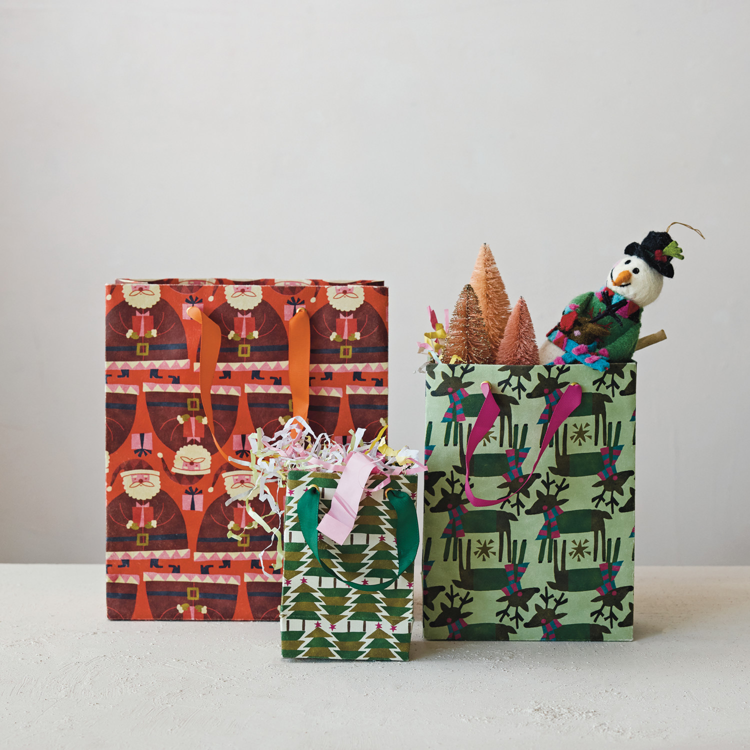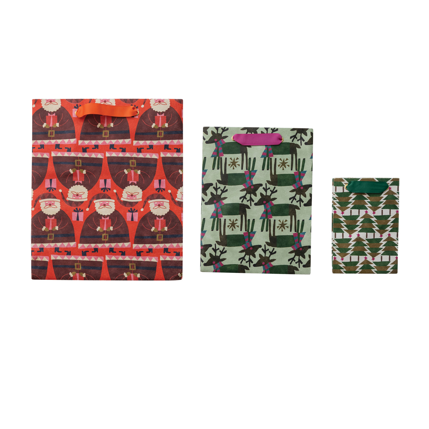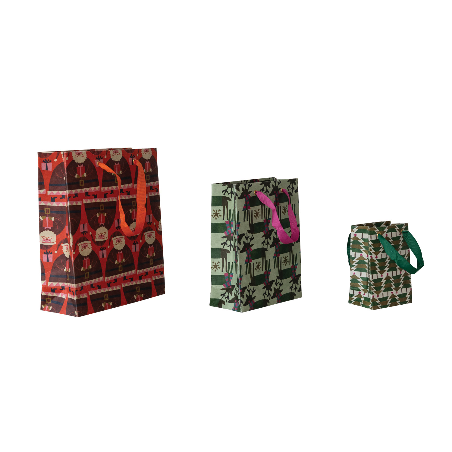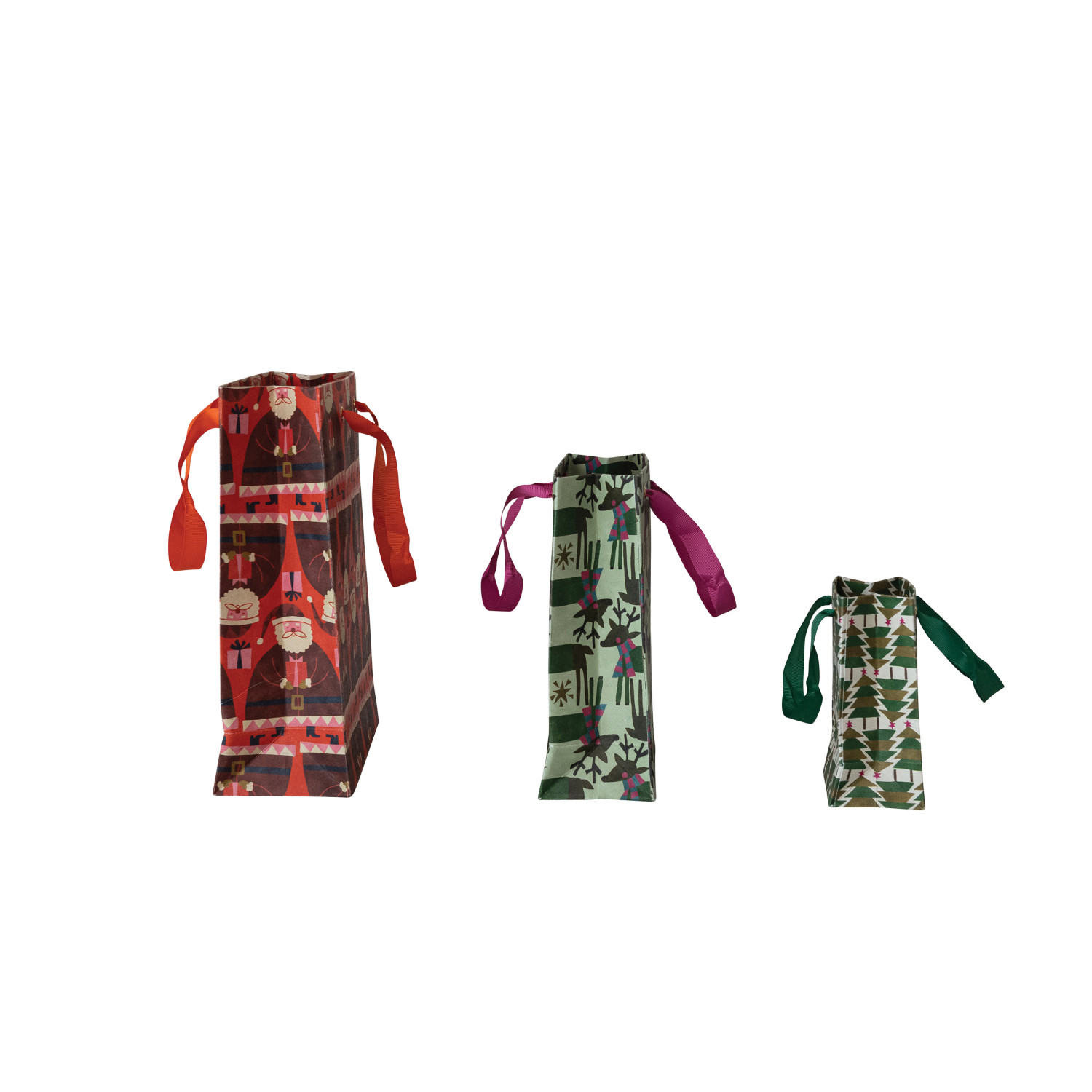 Catalog Name: 10"L x 4"W x 12"H, 7-1/4"L x 3-1/2"W x 9-1/2"H & 4-1/4"L x 2-3/4"W x 6-1/4"H Handmade Printed Recycled Paper Gift Bags w/ Holiday Patterns & Grosgrain Ribbon Handles, Multi Color, Set of 3 ©