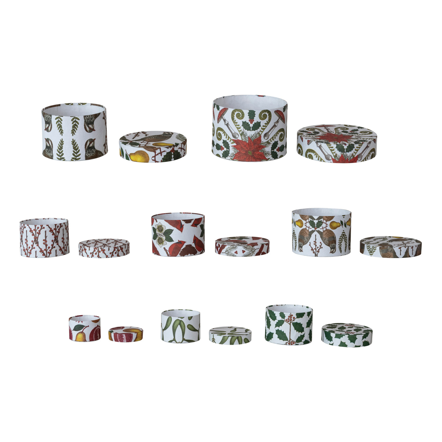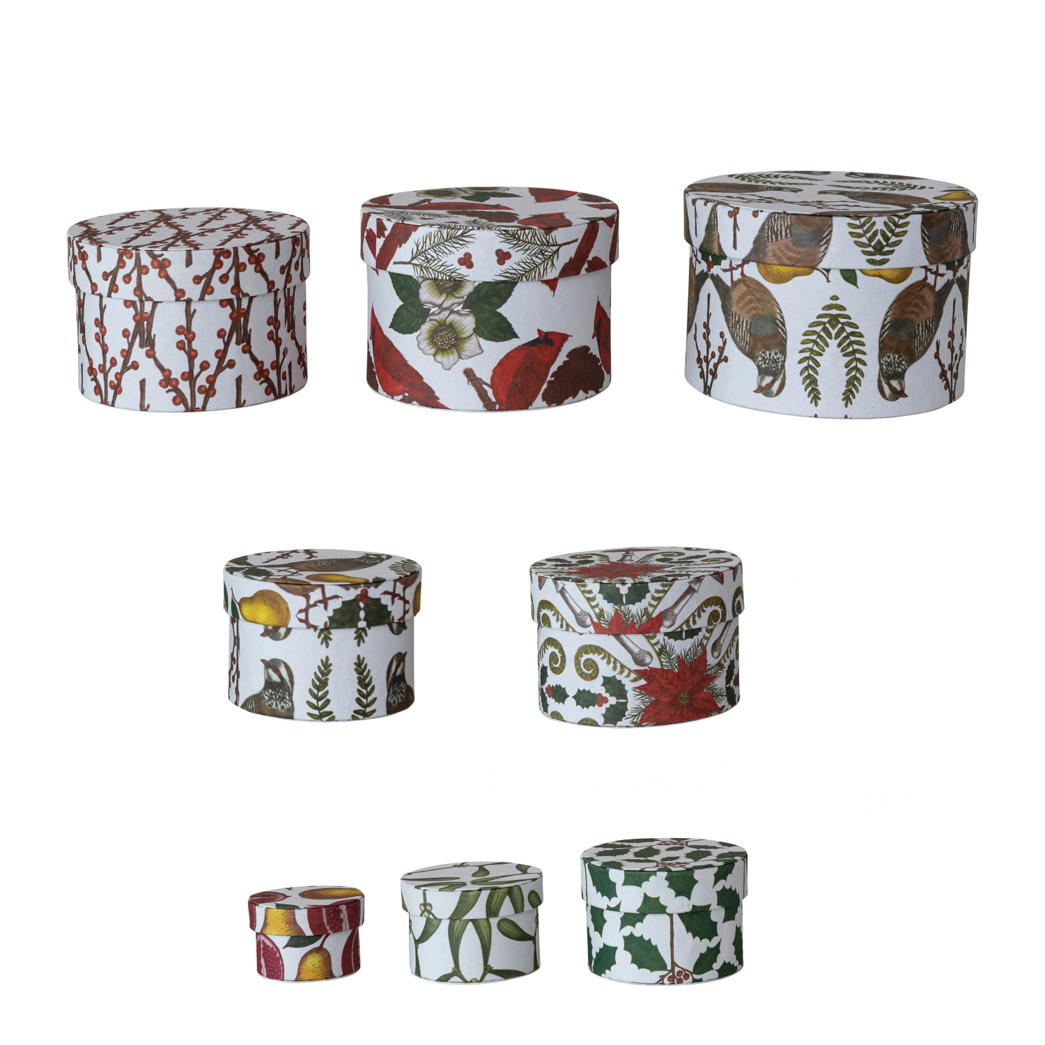 Catalog Name: 2-1/4" Round - 6-1/4" Round Handmade Printed Recycled Paper Nesting Gift Boxes w/ Seasonal Botanicals/Animals Patterns, Multi Color, Set of 8 ©