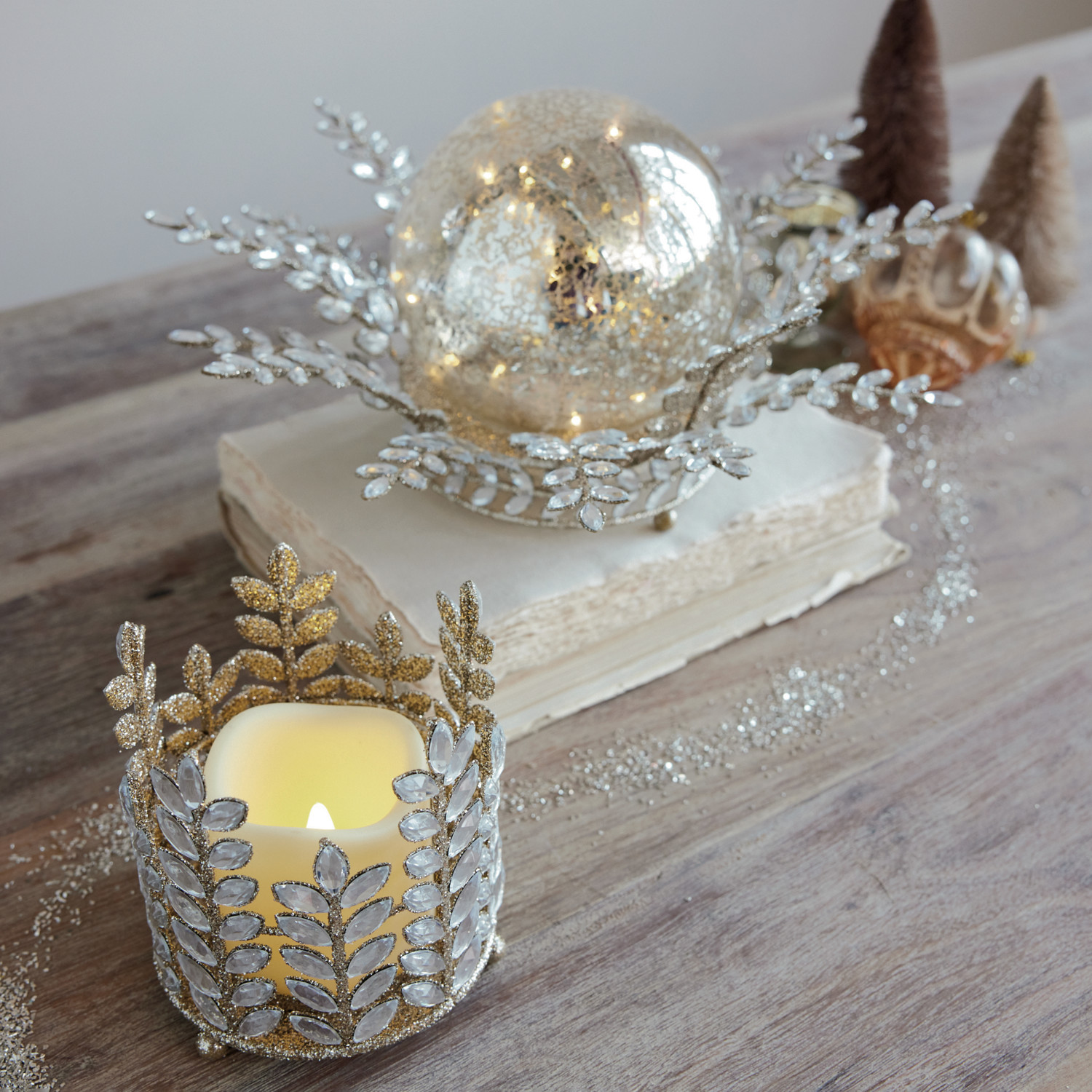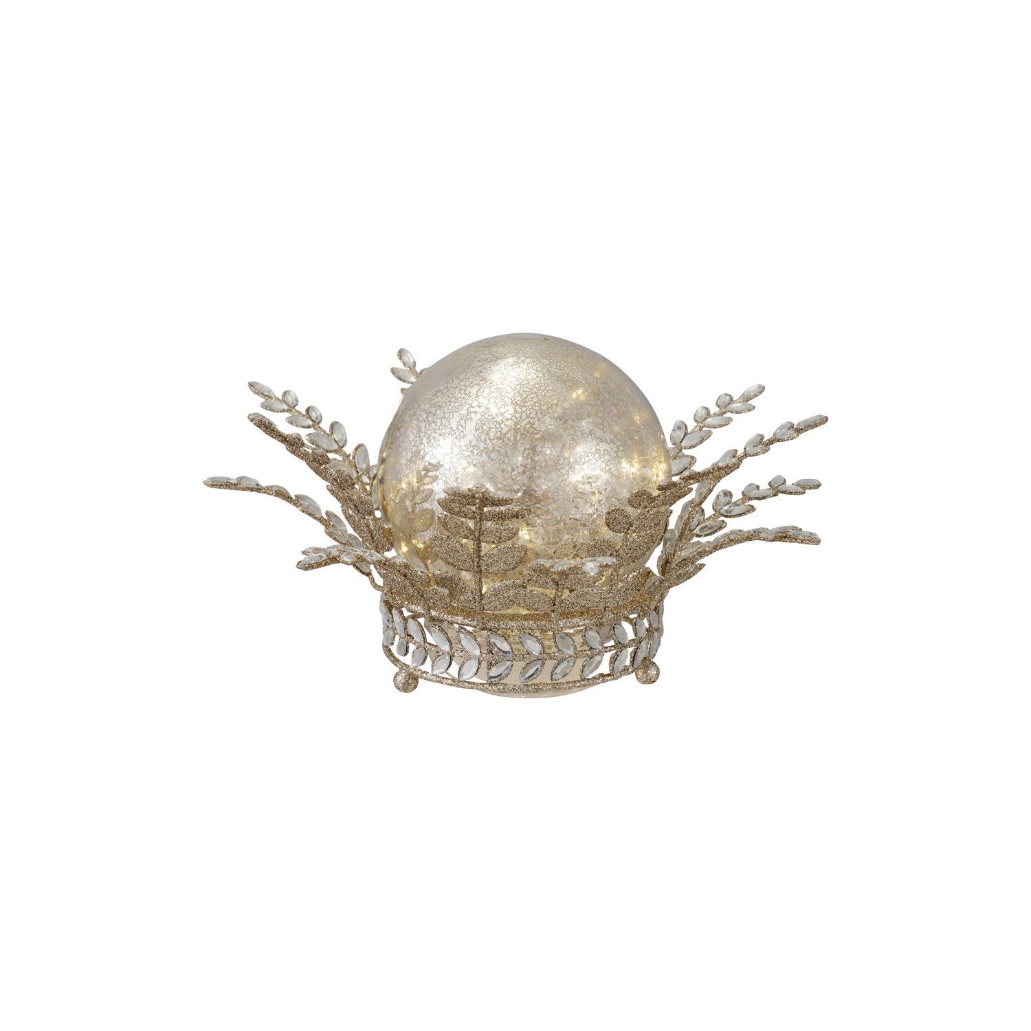 Catalog Name: 13-1/2" Round x 6-1/2"H Metal Stand w/ Acrylic Jewels, Glitter & Mercury Glass LED Orb Light, Champagne Finish (Requires 3-AA Batteries)