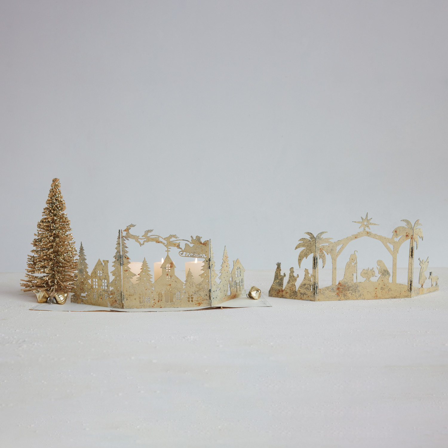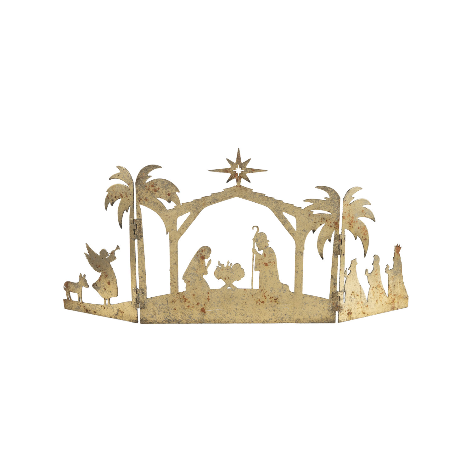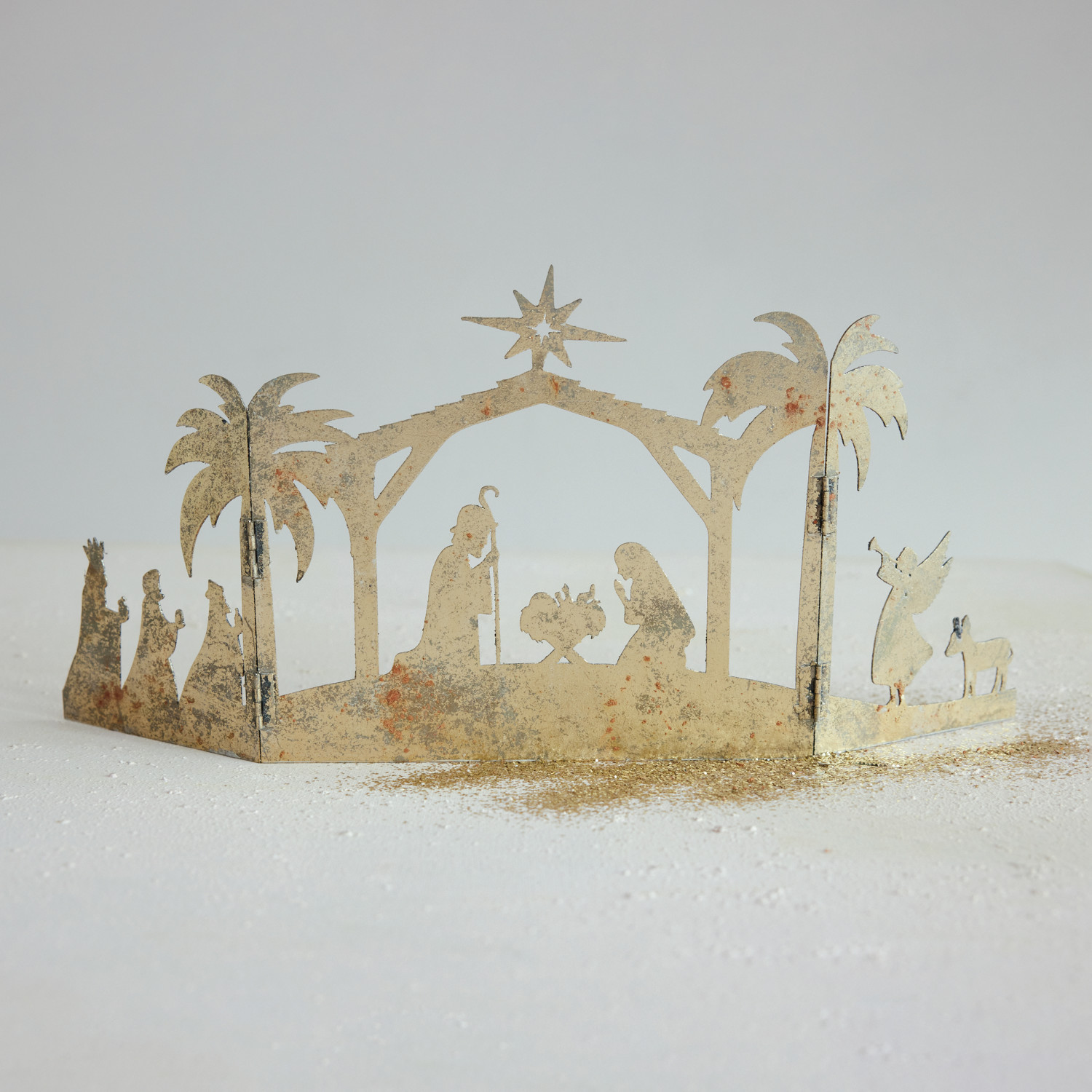Metal Folding Mantle Scene with Nativity, Distressed Gold Finish