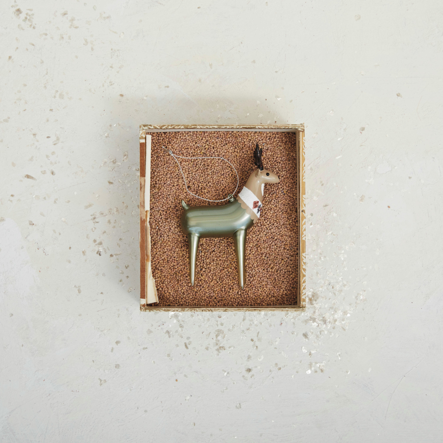 This ornament is a glass-crafted depiction of a deer, hand-painted and adorned with jewels and glitter to capture the enchanting allure of a forest inhabitant. The multi-colored design reflects the diversity of nature's palette, while the glitter adds a festive sparkle. Measuring 3.75 inches long, 2.25 inches wide, and 5.25 inches high, it's a significant addition to any holiday decor, inviting onlookers to admire the grace and tranquility of the deer. This is a perfect choice for anyone who loves whimsical and adorable holiday decor. A glass deer ornament, embellished with jewels and glitter, radiating the serene beauty of a multi-colored woodland creature. An ornament that captures the spirit of the forest, perfect for adding a touch of nature's elegance to the holiday decor. Perfect for bringing a piece of the enchanted forest to the Christmas tree or as a charming accent in a rustic-themed room.
