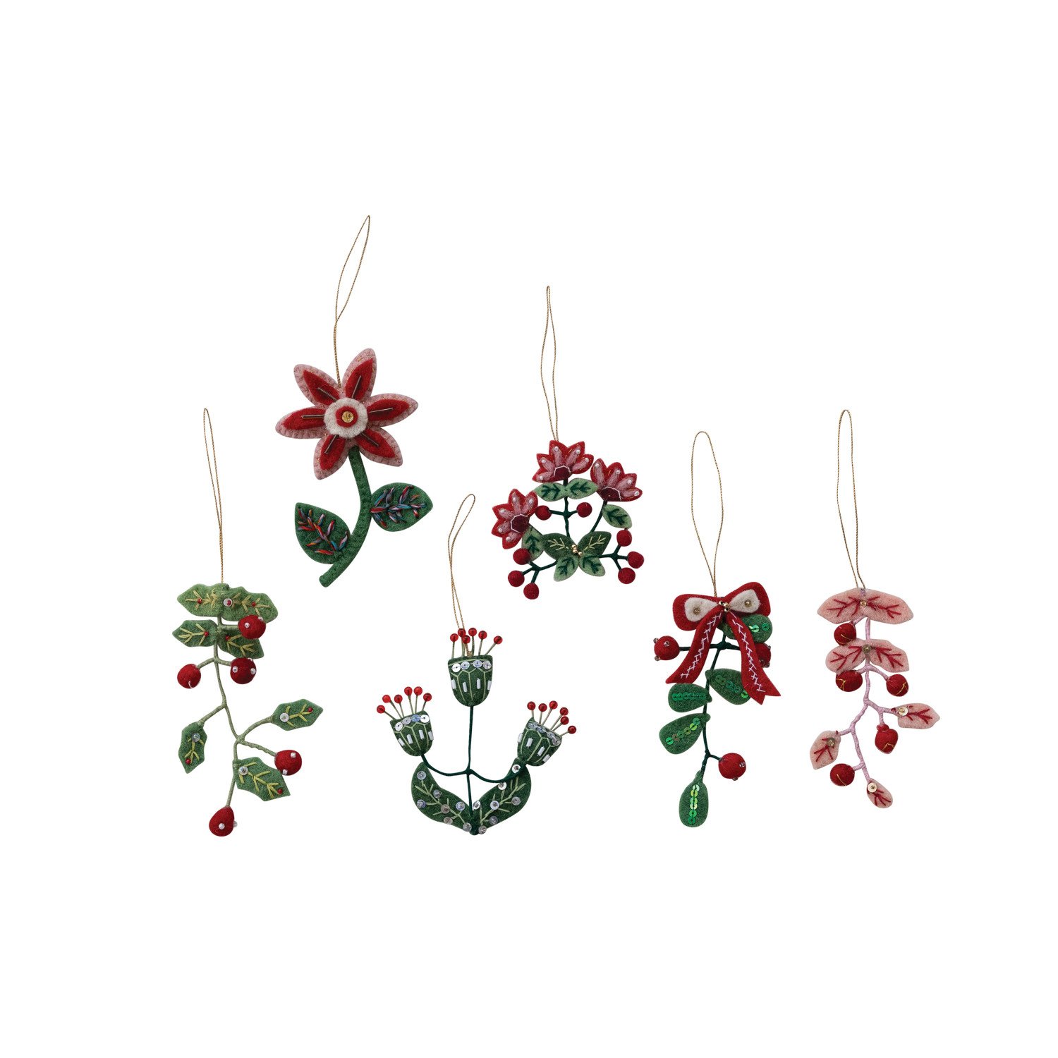 Catalog Name: 3-1/4"H - 5"H Handmade Wired Wool Felt Holiday Botanical Ornament w/ Embroidery, Sequins & Glass Beads, Multi Color, 6 Styles ©