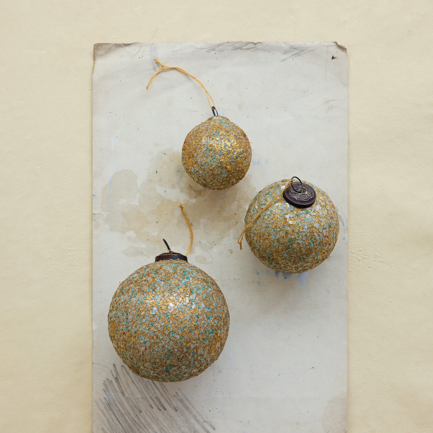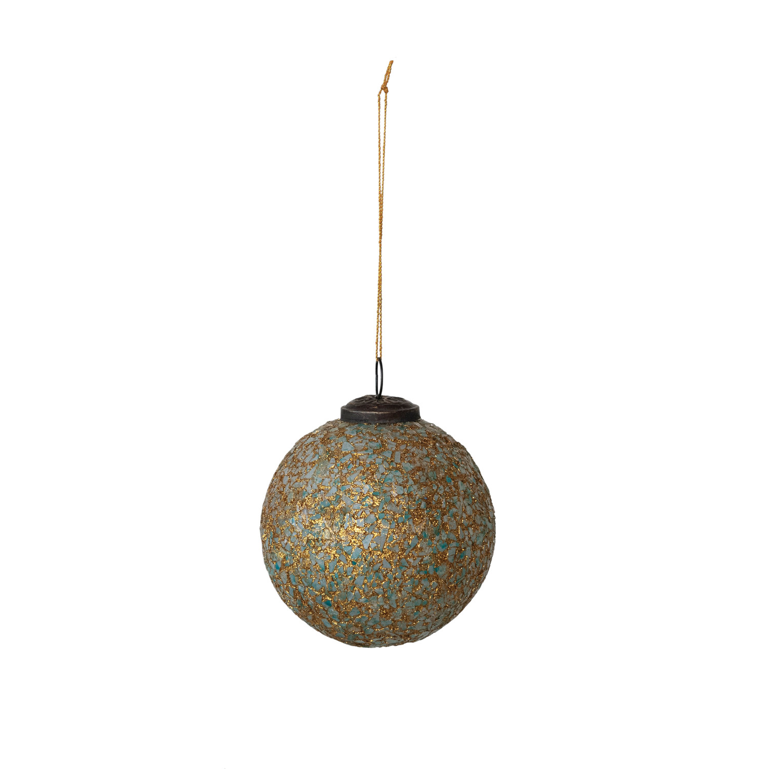 Glass Ball Ornament with Mica Flakes, Gold Finish & Teal
