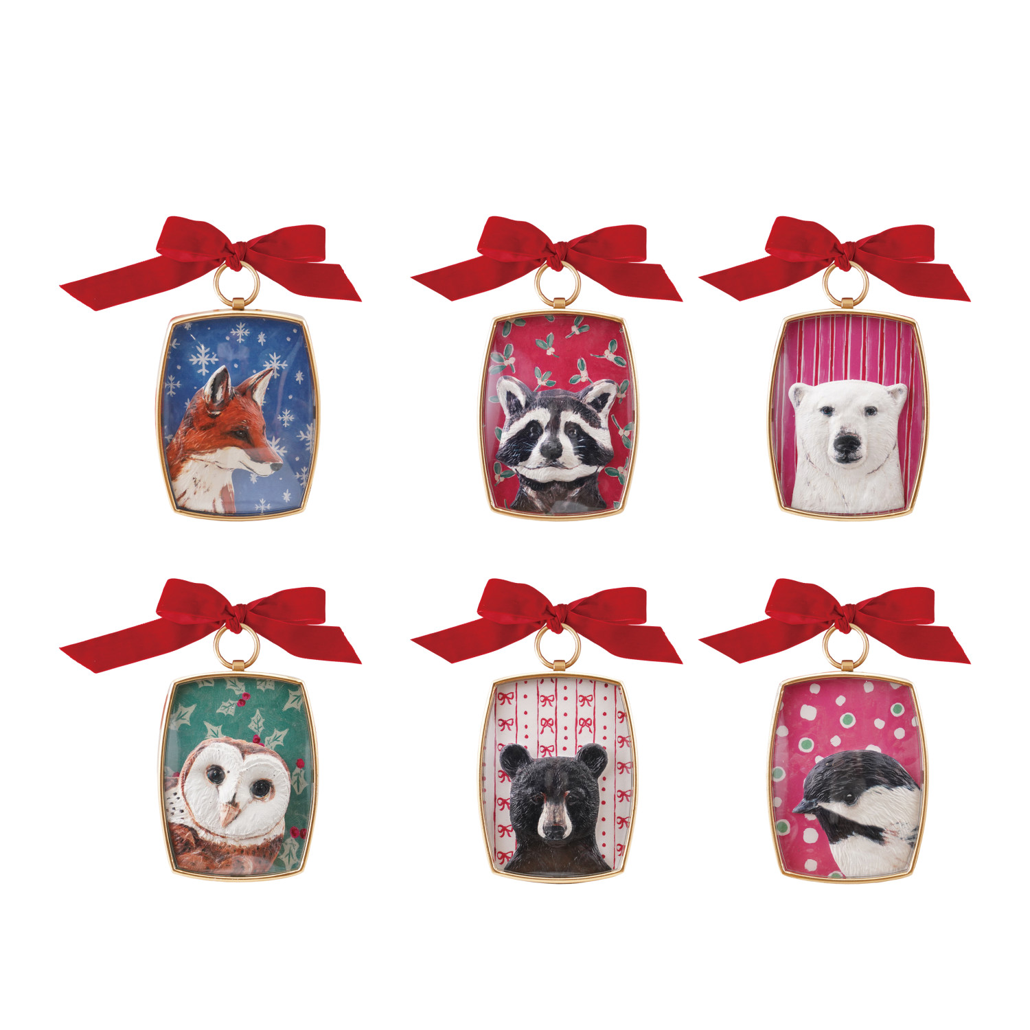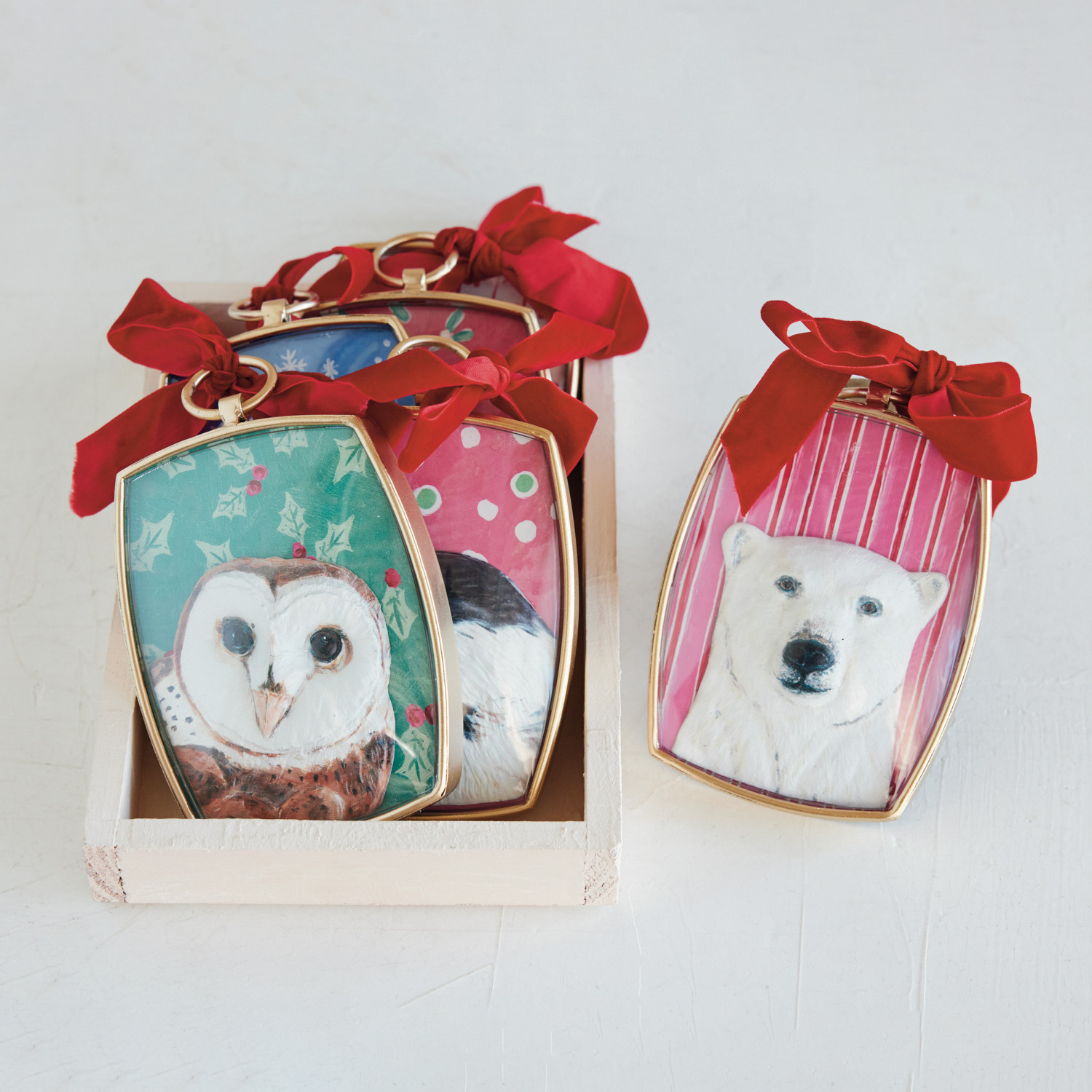 Catalog Name: 7"H Metal Framed Convex Plastic Ornament w/ Bow, Holiday Pattern & Animal, Multi Color, 6 Styles ©