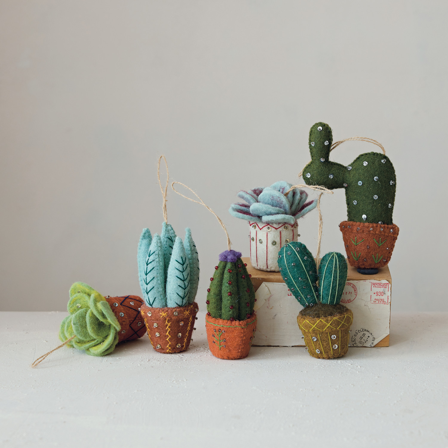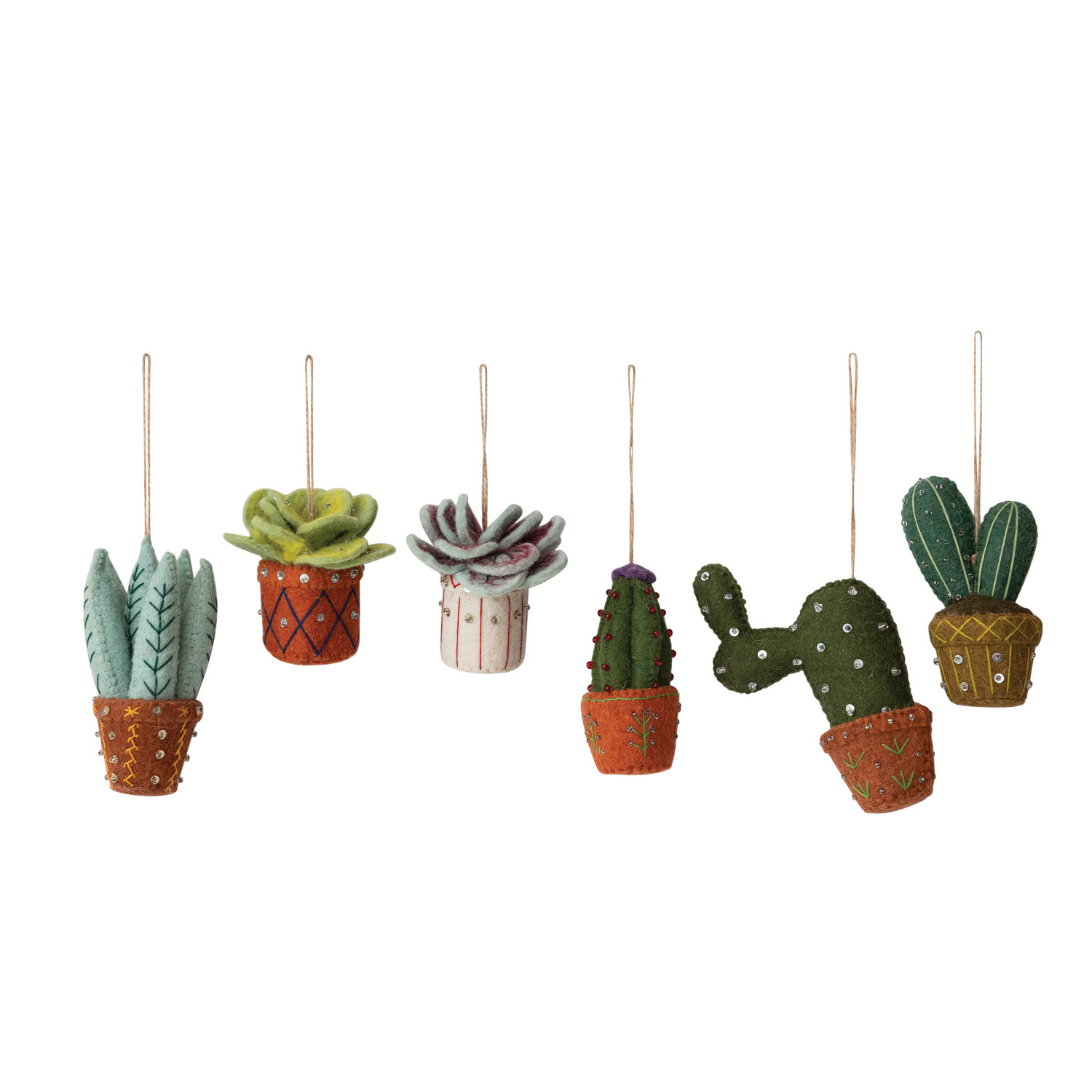 Handmade Wool Felt Cactus in Planter Ornament with Embroidery, Sequins & Beads, 6 Styles