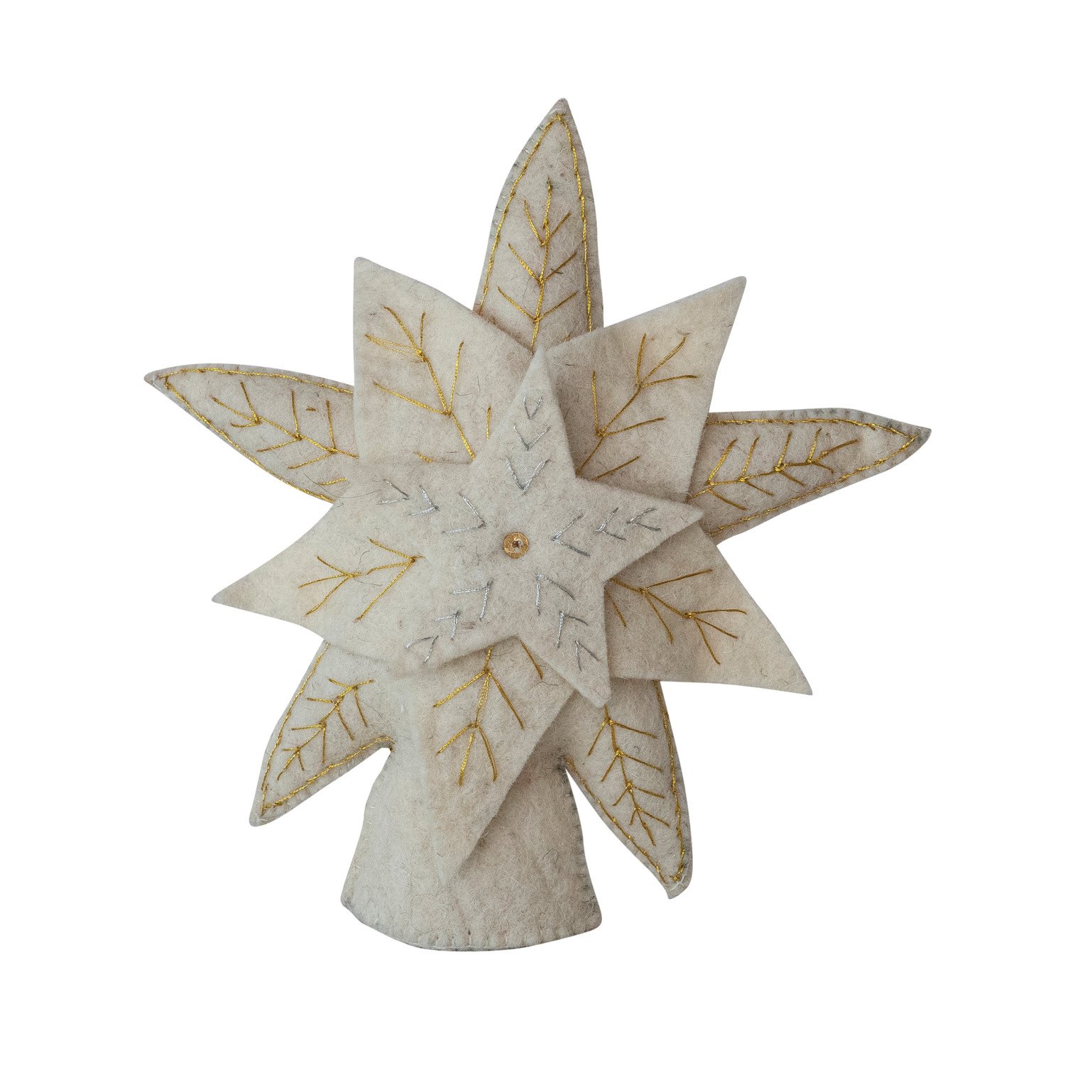 Catalog Name: 6-1/2"L x 1-1/2"W x 8-1/2"H Handmade Wool Felt Star Tree Topper w/ Metallic Thread Embroidery, Cream Color