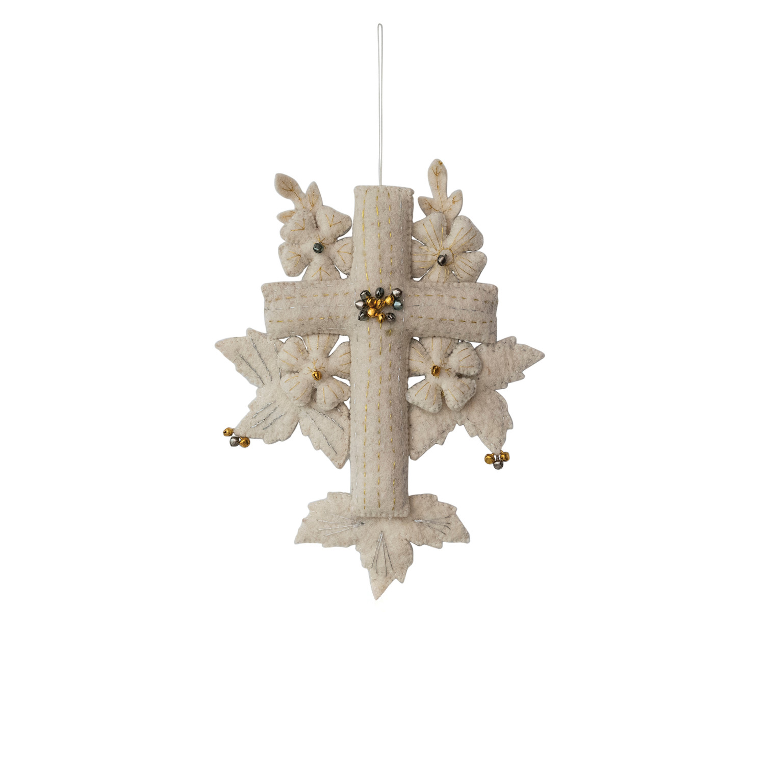 Catalog Name: 12"H Handmade Wool Felt Cross & Flowers Ornament w/ Metallic Thread Embroidery & Jingle Bells, Cream Color