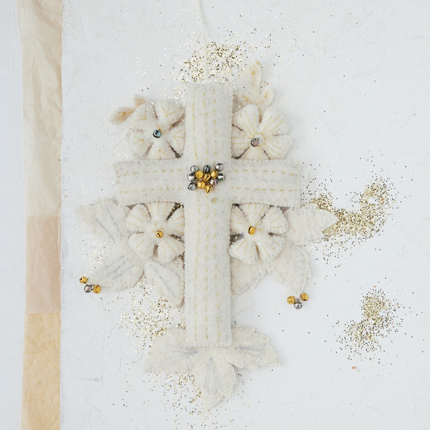 Handmade Wool Felt Cross & Flowers Ornament with Metallic Thread Embroidery & Jingle Bells