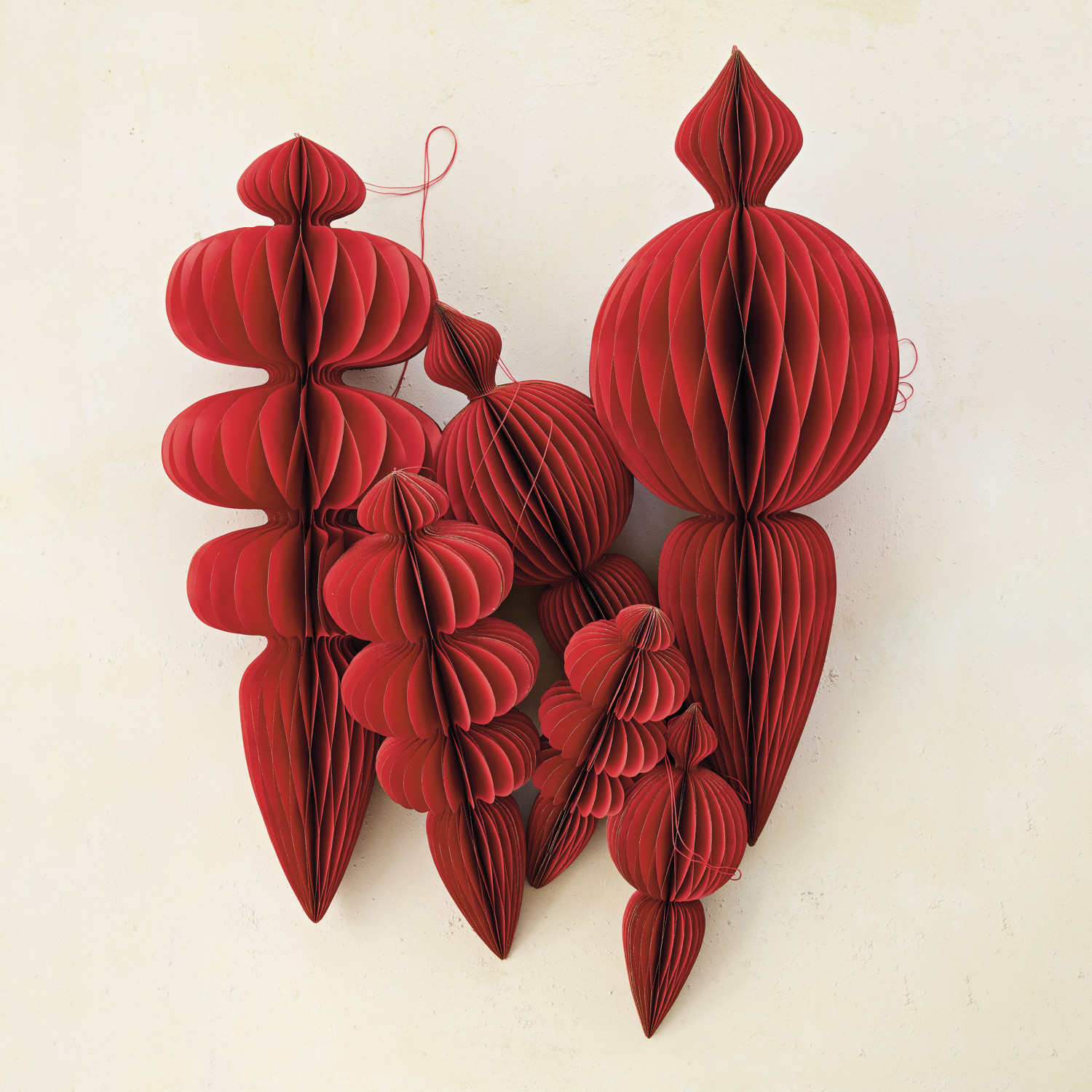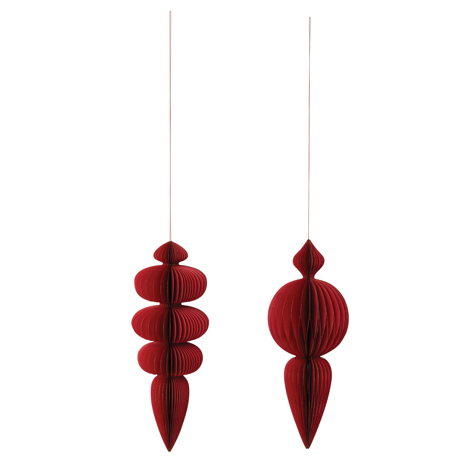 Catalog Name: 10" Round x 26"H Oversized Handmade Recycled Paper Folding Honeycomb Finial Ornament w/ Gold Glitter Edges, Red, 2 Styles