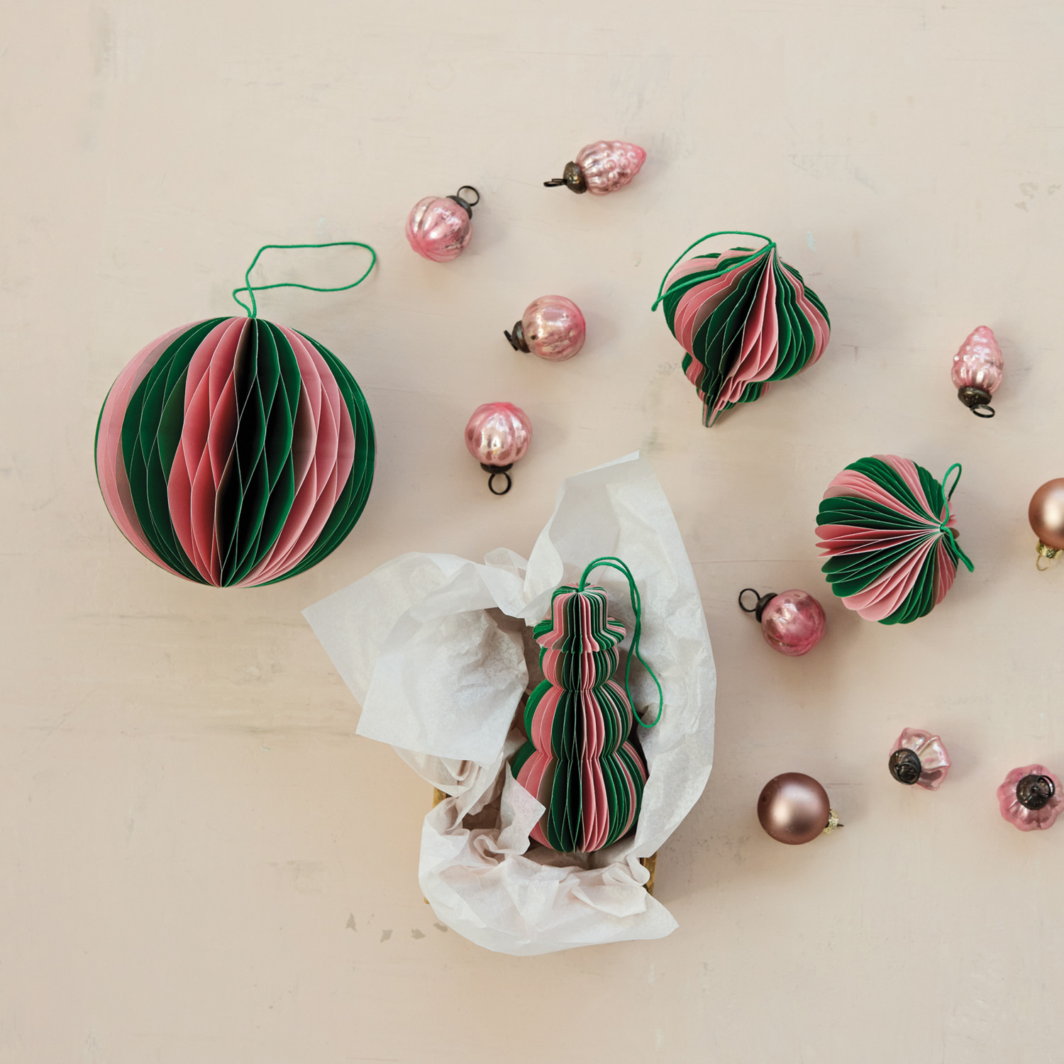 Catalog Name: 5" Round Handmade Recycled Paper Folding Honeycomb Ball Ornament, Green & Pink
