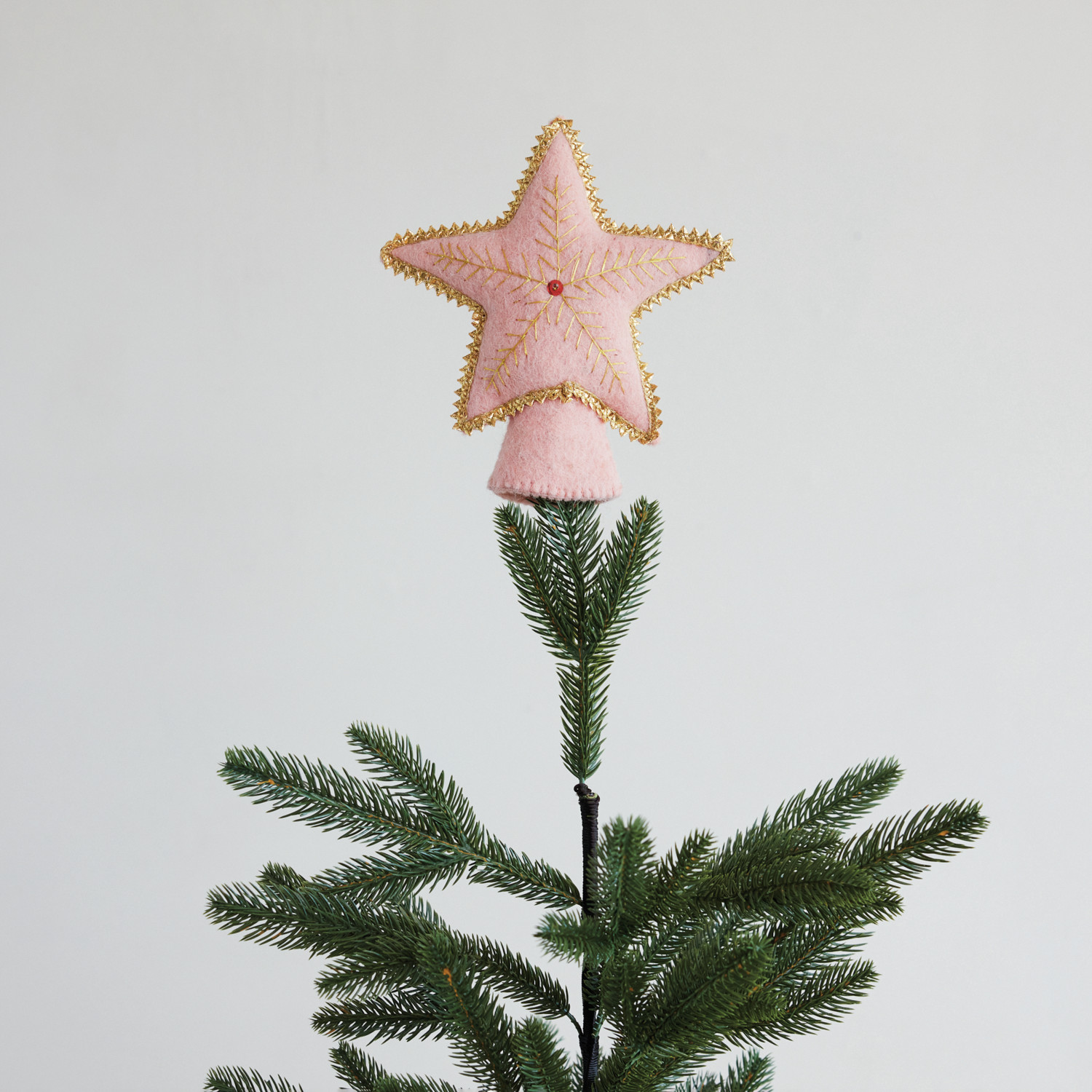 Catalog Name: 6-1/2"L x 1-1/2"W x 7-1/2"H Handmade Wool Felt Star Tree Topper w/ Metallic Gold Thread Embroidery, Pink