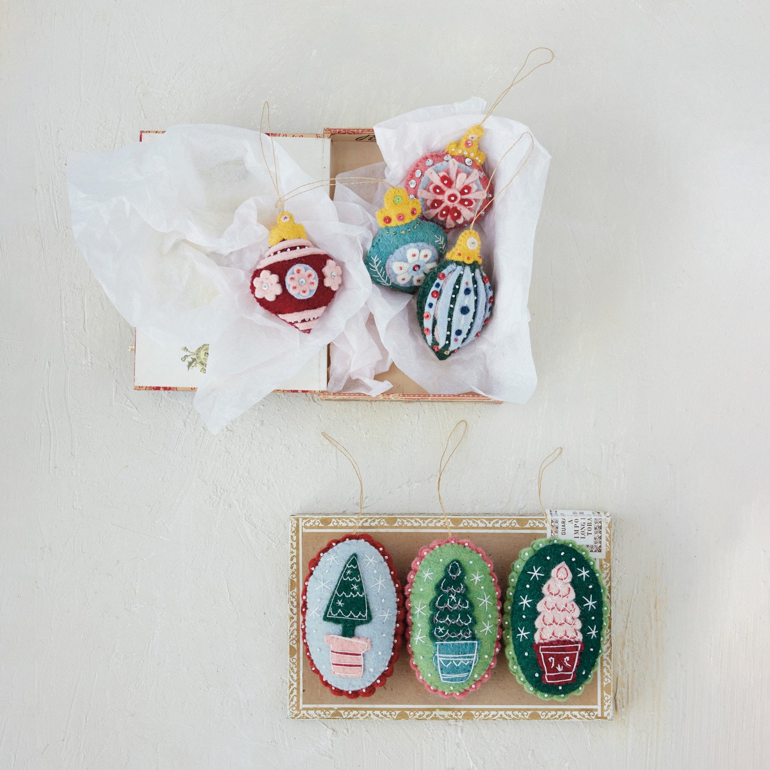Handmade Wool Felt Ornament with Tree, Embroidery, Beads & Scalloped Trim, 3 Styles ©