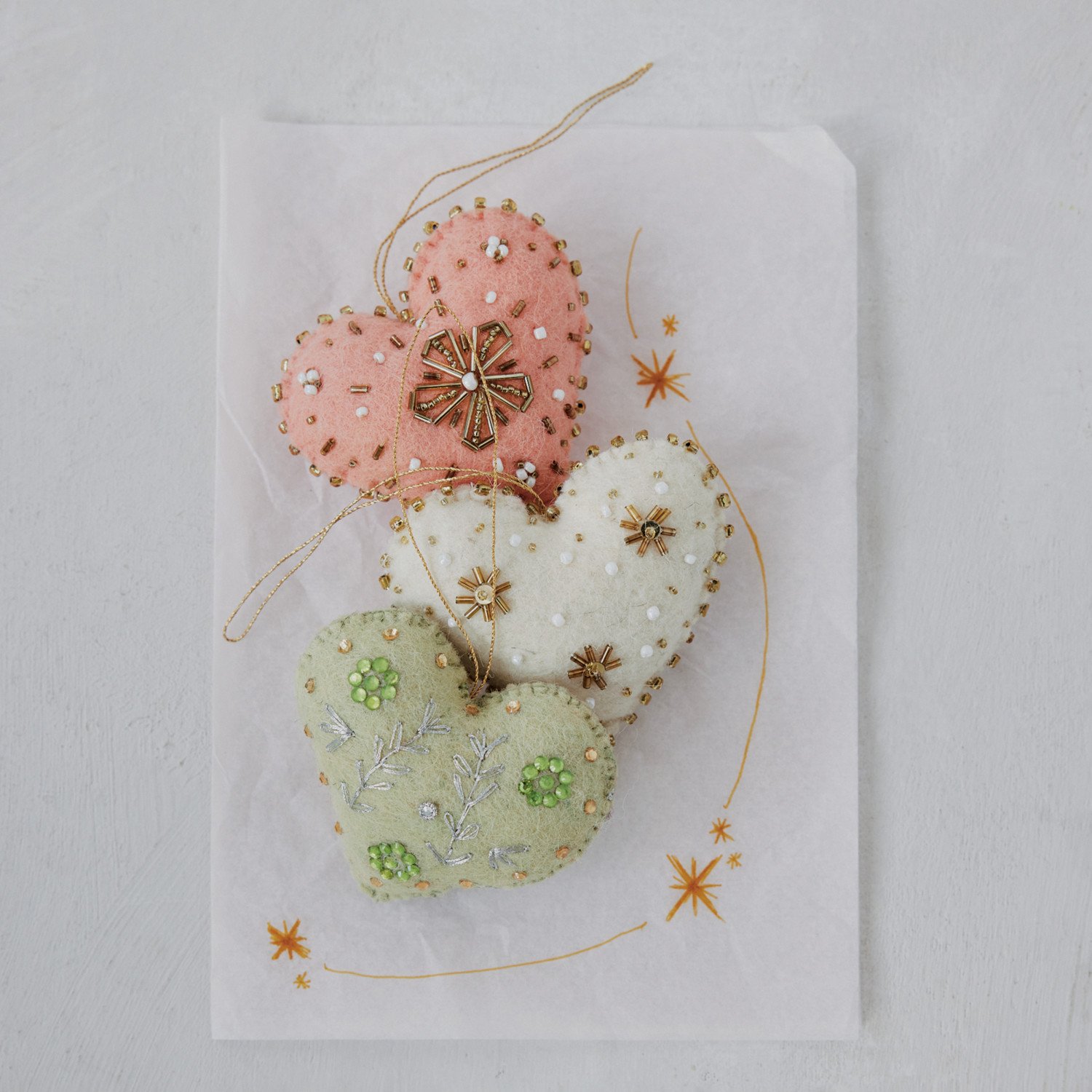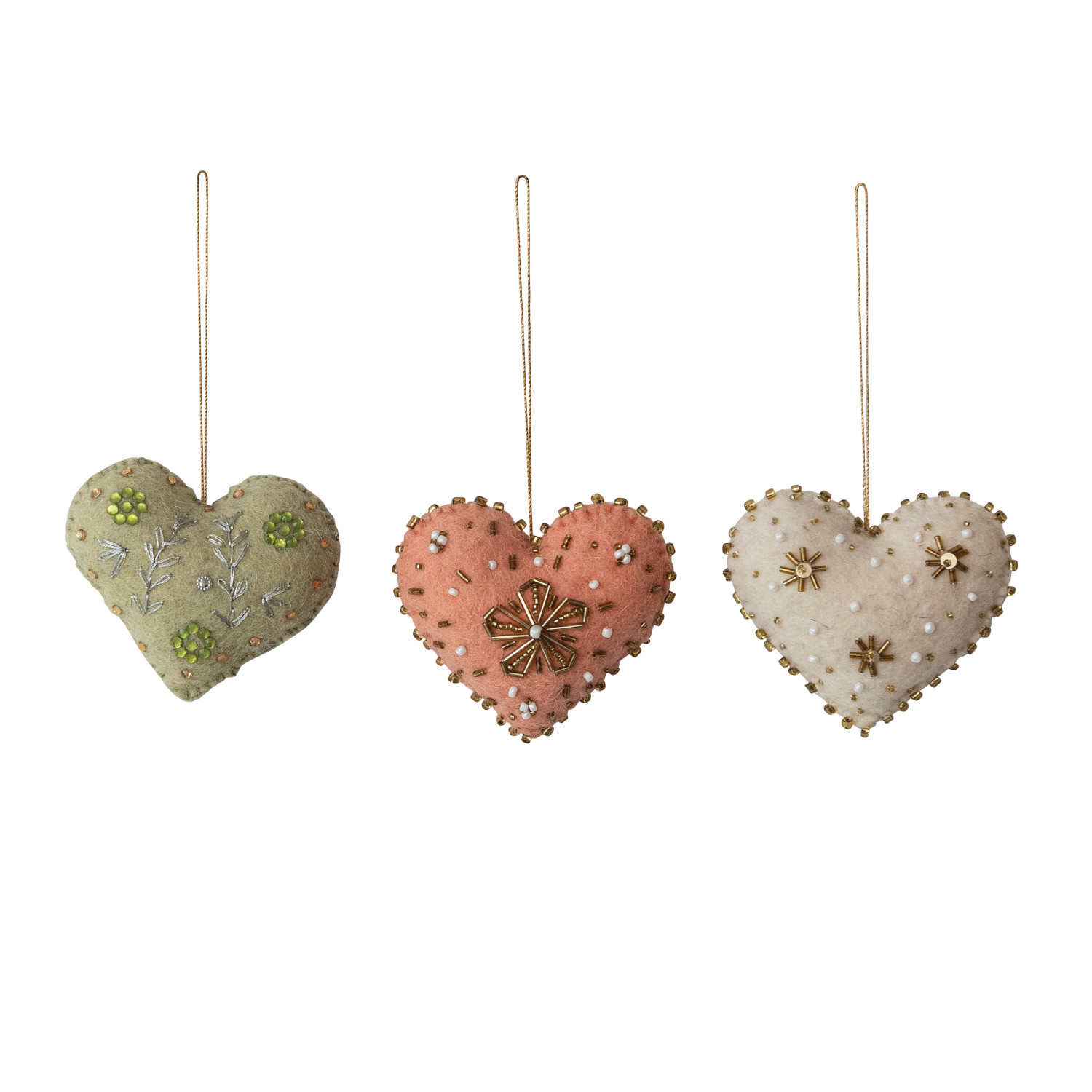 Handmade Wool Felt Heart Ornament with Embroidery & Beads, 3 Styles