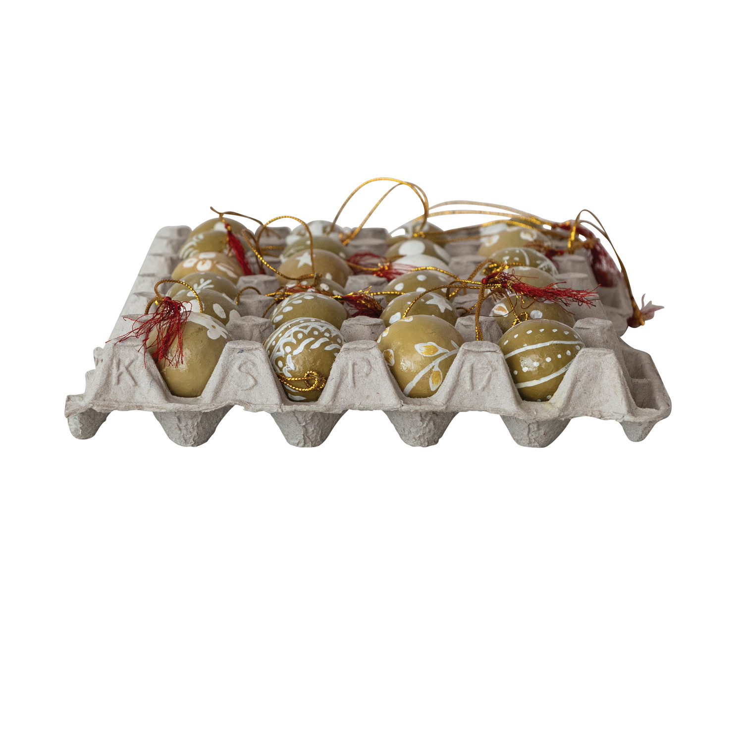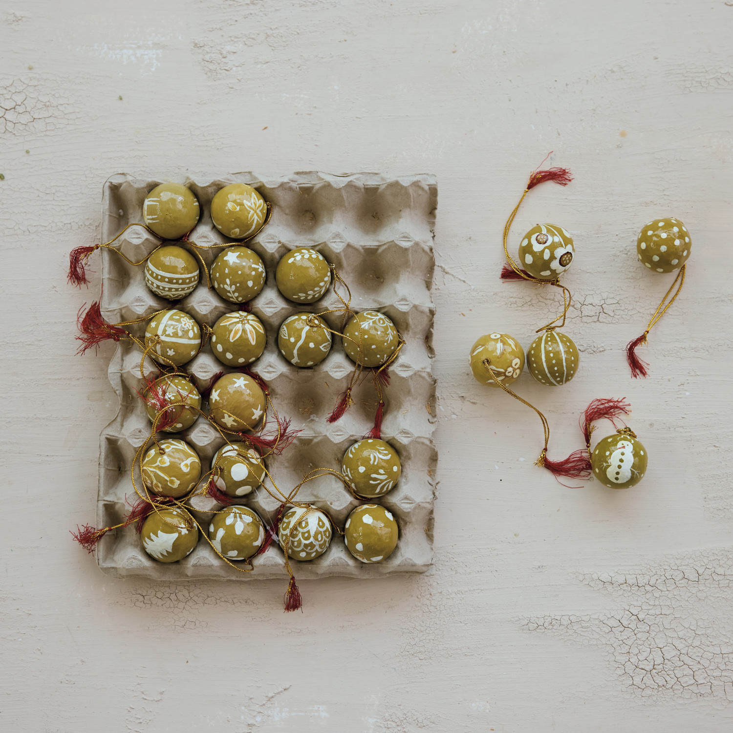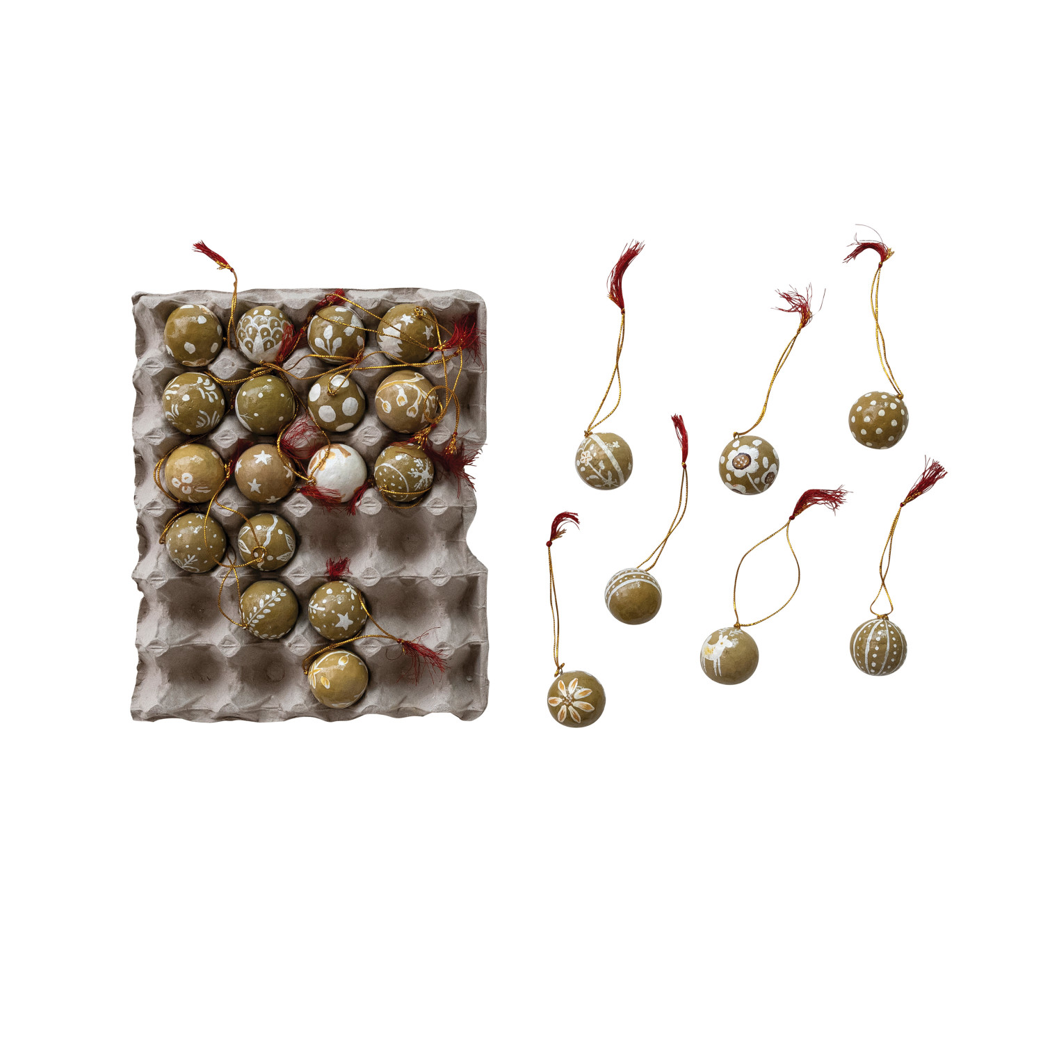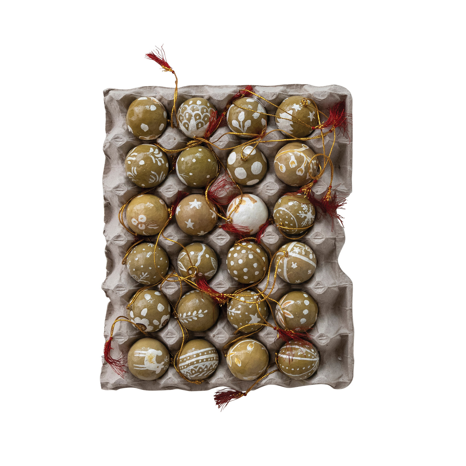 Hand-Painted Paper Mache Ball Ornaments with Design & Tassel in Egg Crate, Set of 24