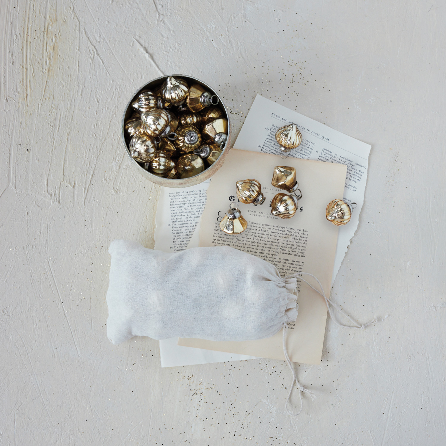 Embossed Mercury Glass Ornaments in Muslin Bag, Gold Finish, Set of 36