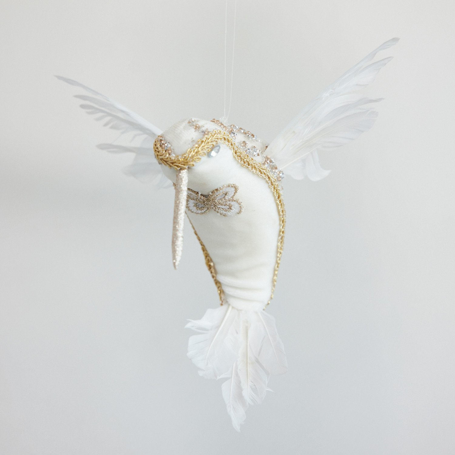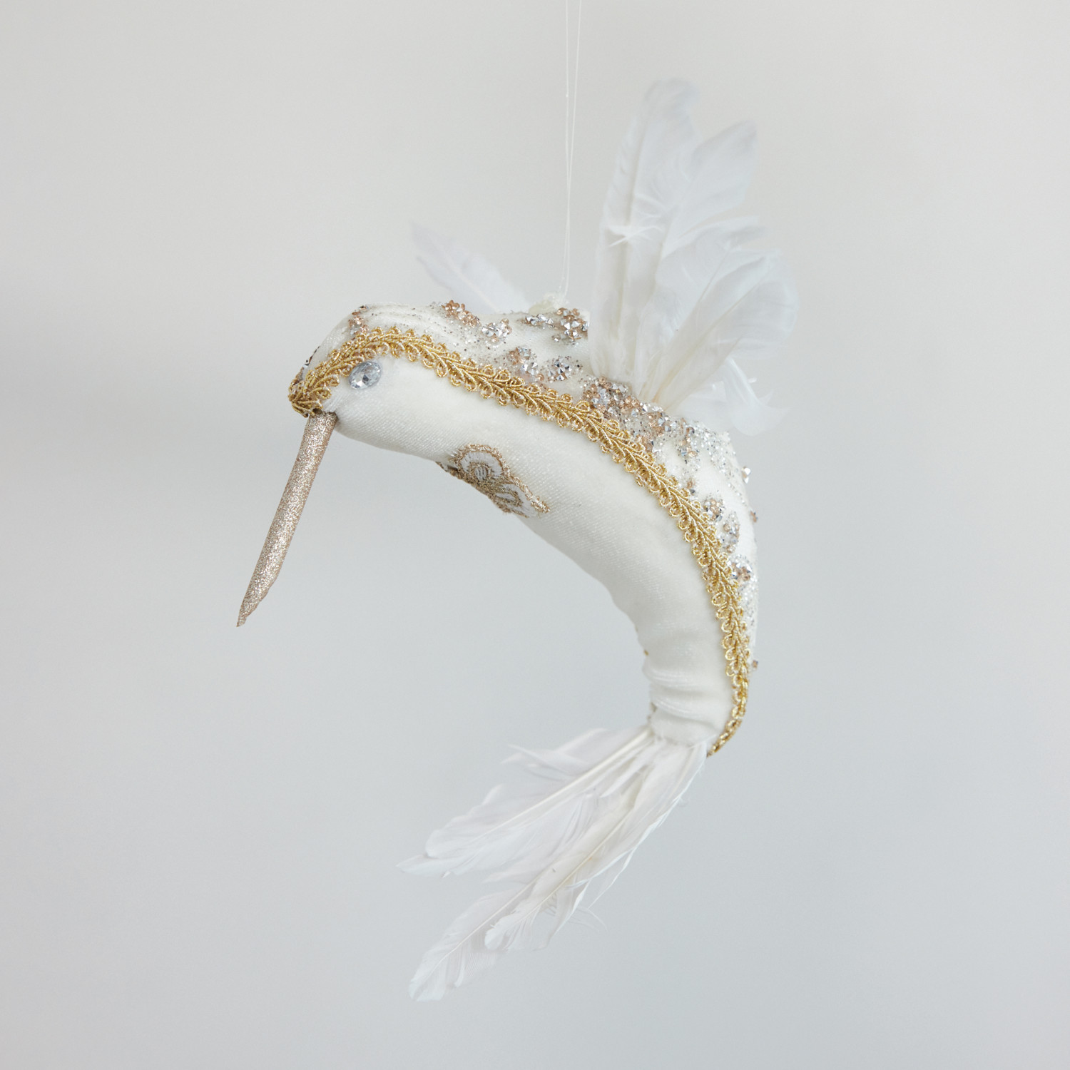 Catalog Name: 7-1/2"H Fabric & Foam Hummingbird Ornament w/ Feathers & Jewels, White & Gold Finish