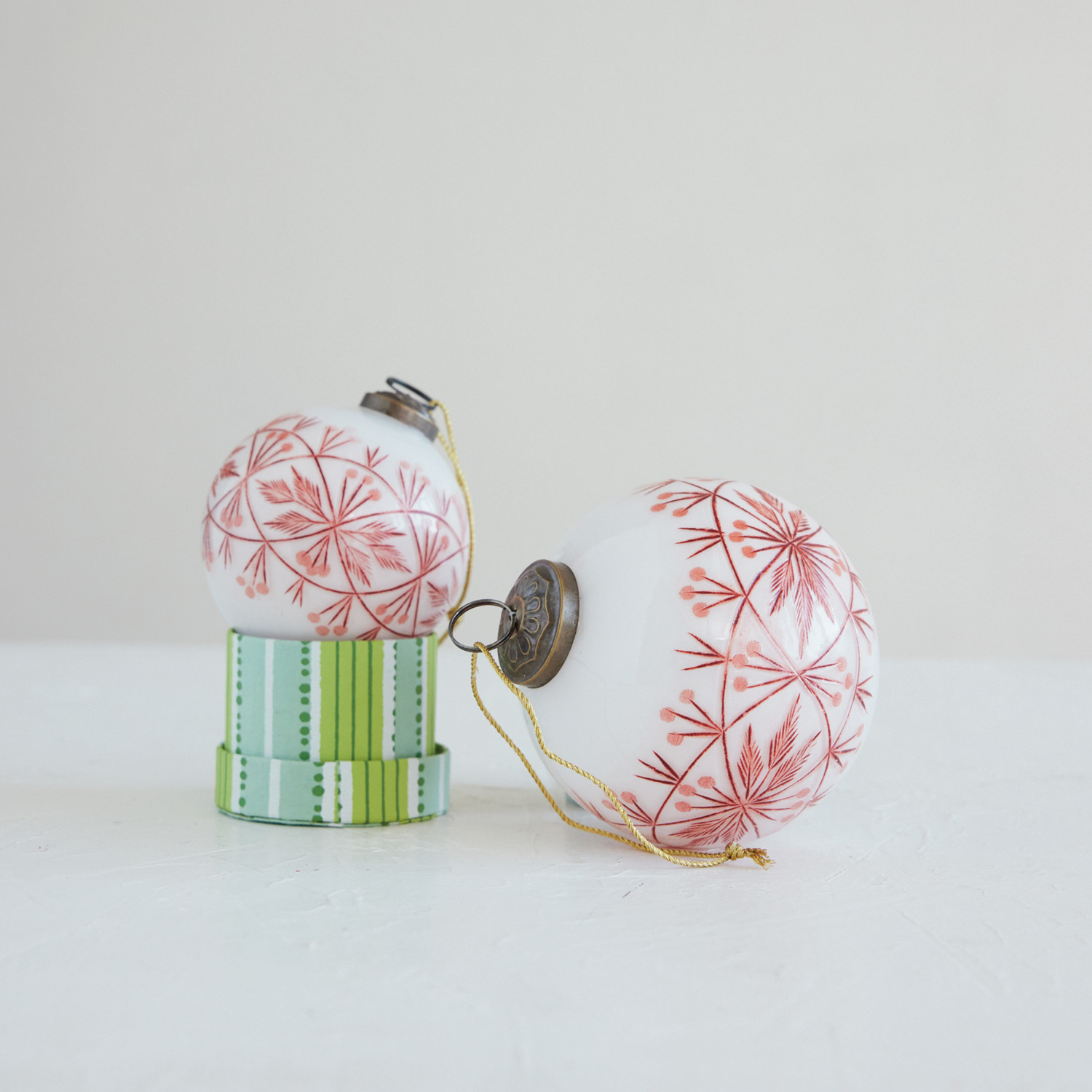 Catalog Name: 3" Round Hand-Blown Etched Glass Ball Ornament w/ Design, White & Red