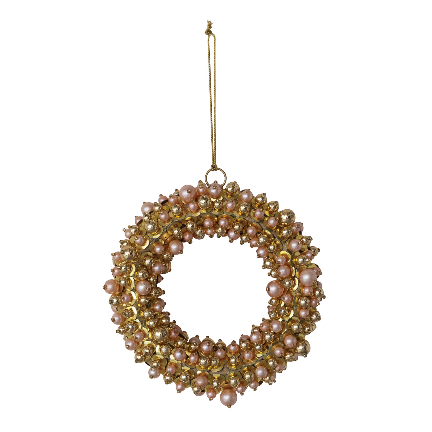 Faux Pearl & Glass Beaded Wreath Ornament with Sequins, Gold Finish & Pink