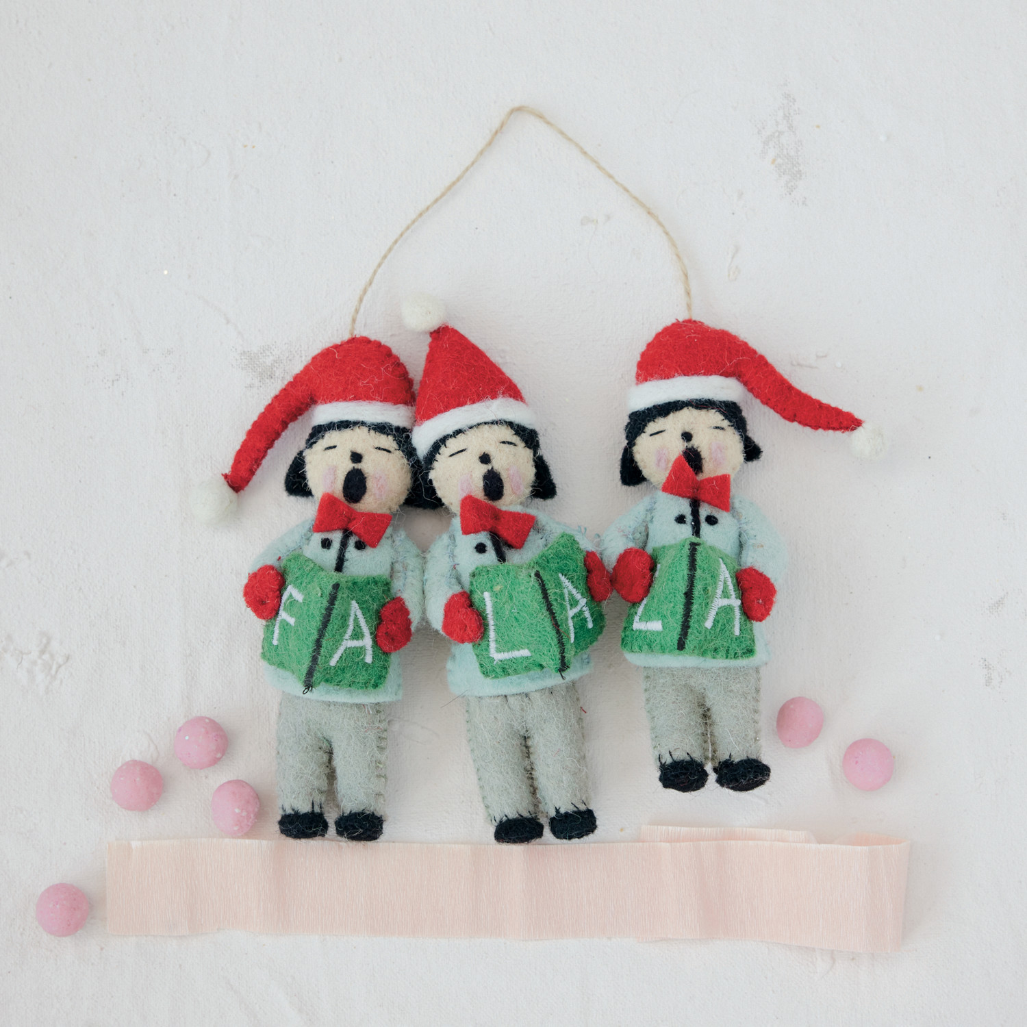 Catalog Name: 6"L x 6-1/2"H Wool Felt Carolers in Santa Hats Ornament "Fa La La", Multi Color ©