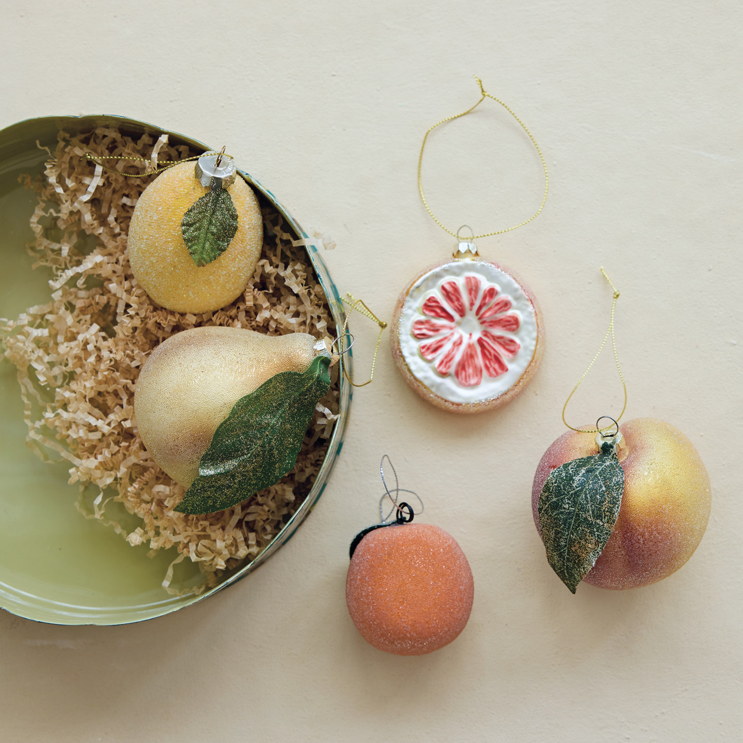 Catalog Name: 3-1/2"H Hand-Painted Glass Peach Ornament w/ Glitter & Sugar, Orange Color & Green