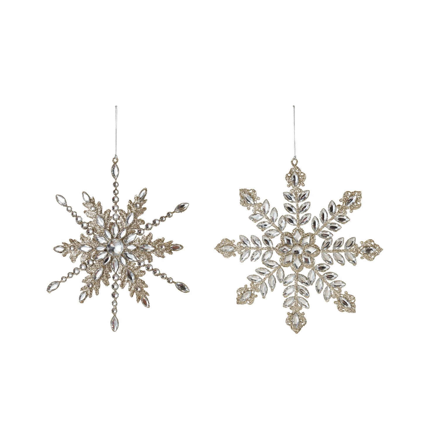 Catalog Name: 8-3/4"H - 9"H Metal Snowflake Ornament w/ Acrylic Jewels & Glitter, Champagne Finish, 2 Styles