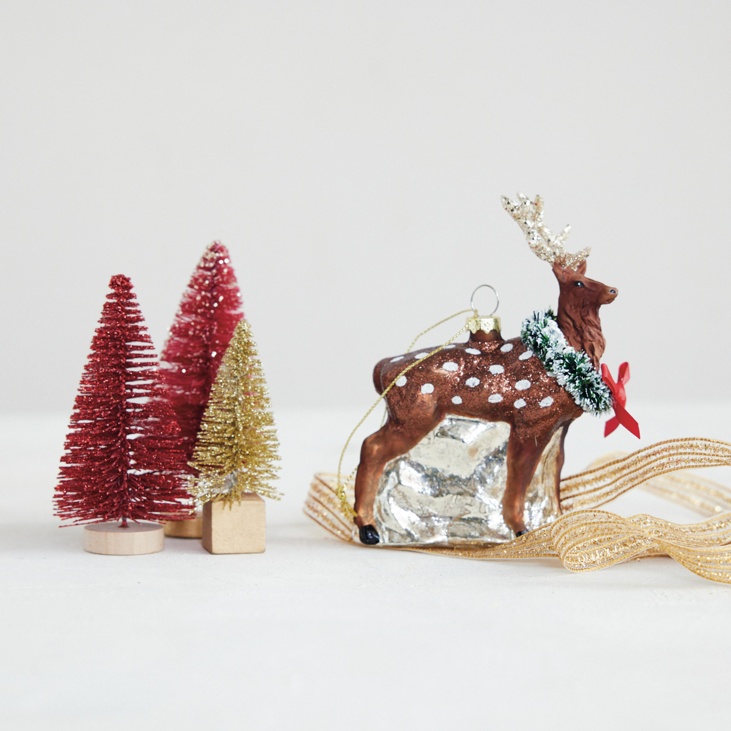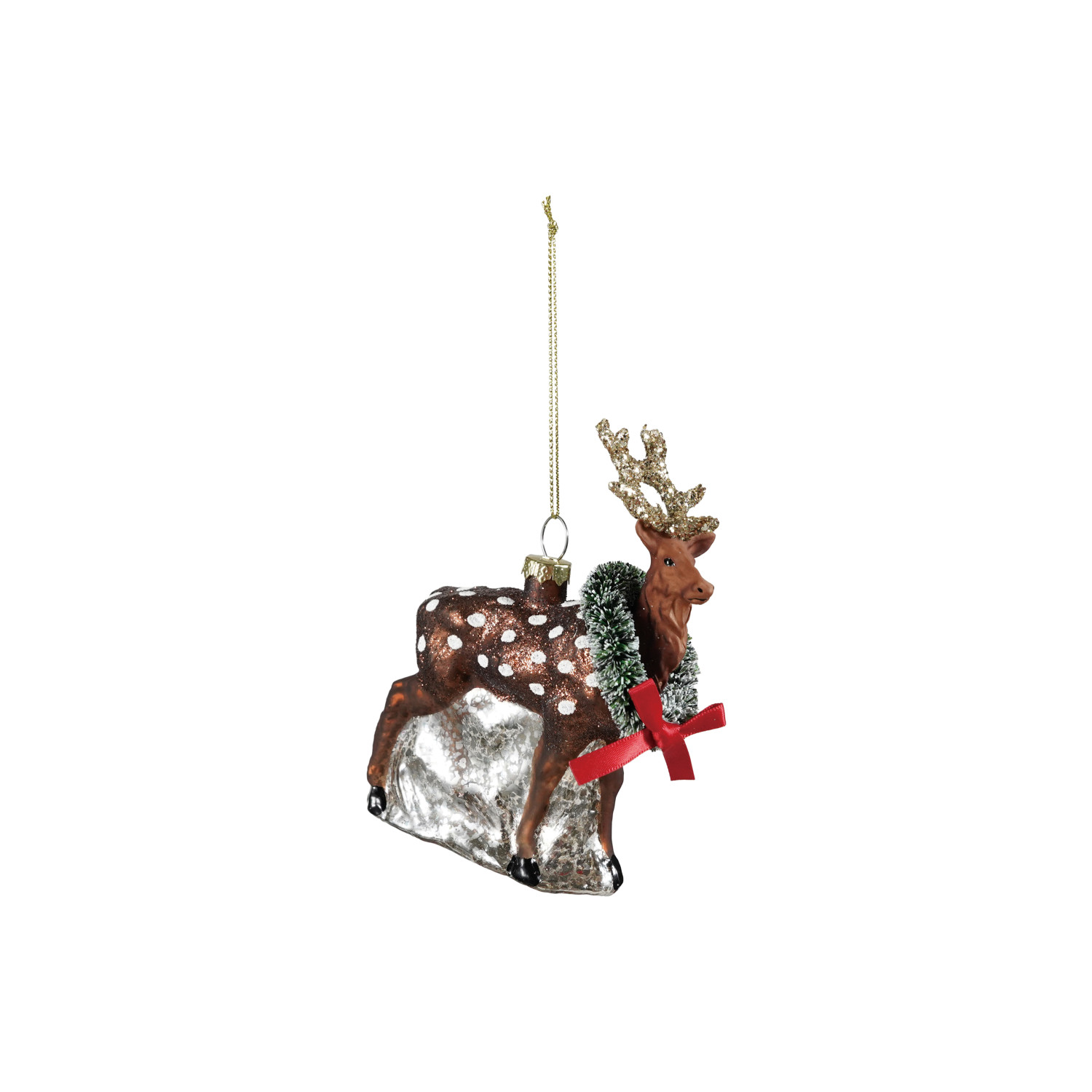 Glass Deer Ornament with Wreath, Bow & Glitter ©